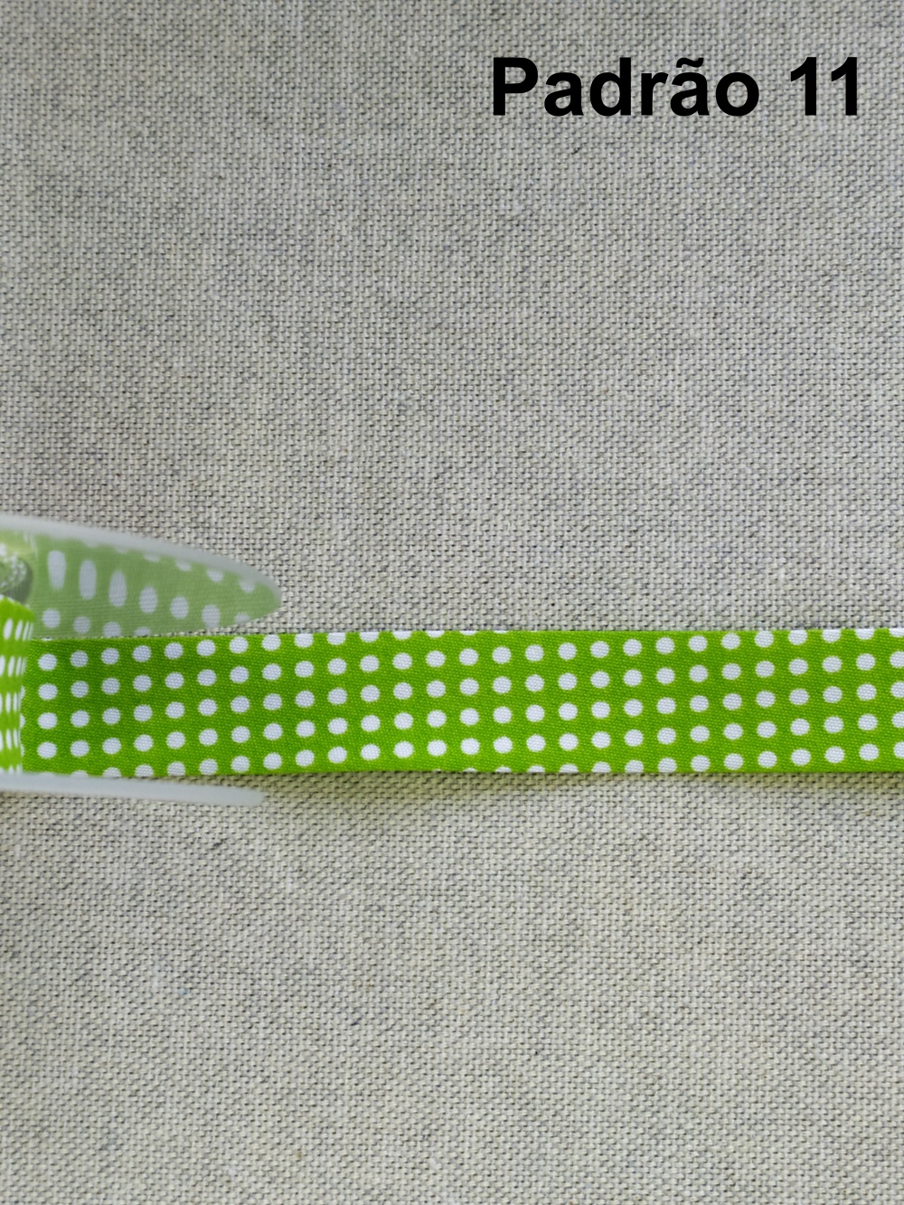 Fita verde com pontos brancos sobre tecido cinzento, com texto 'Padrão 11'