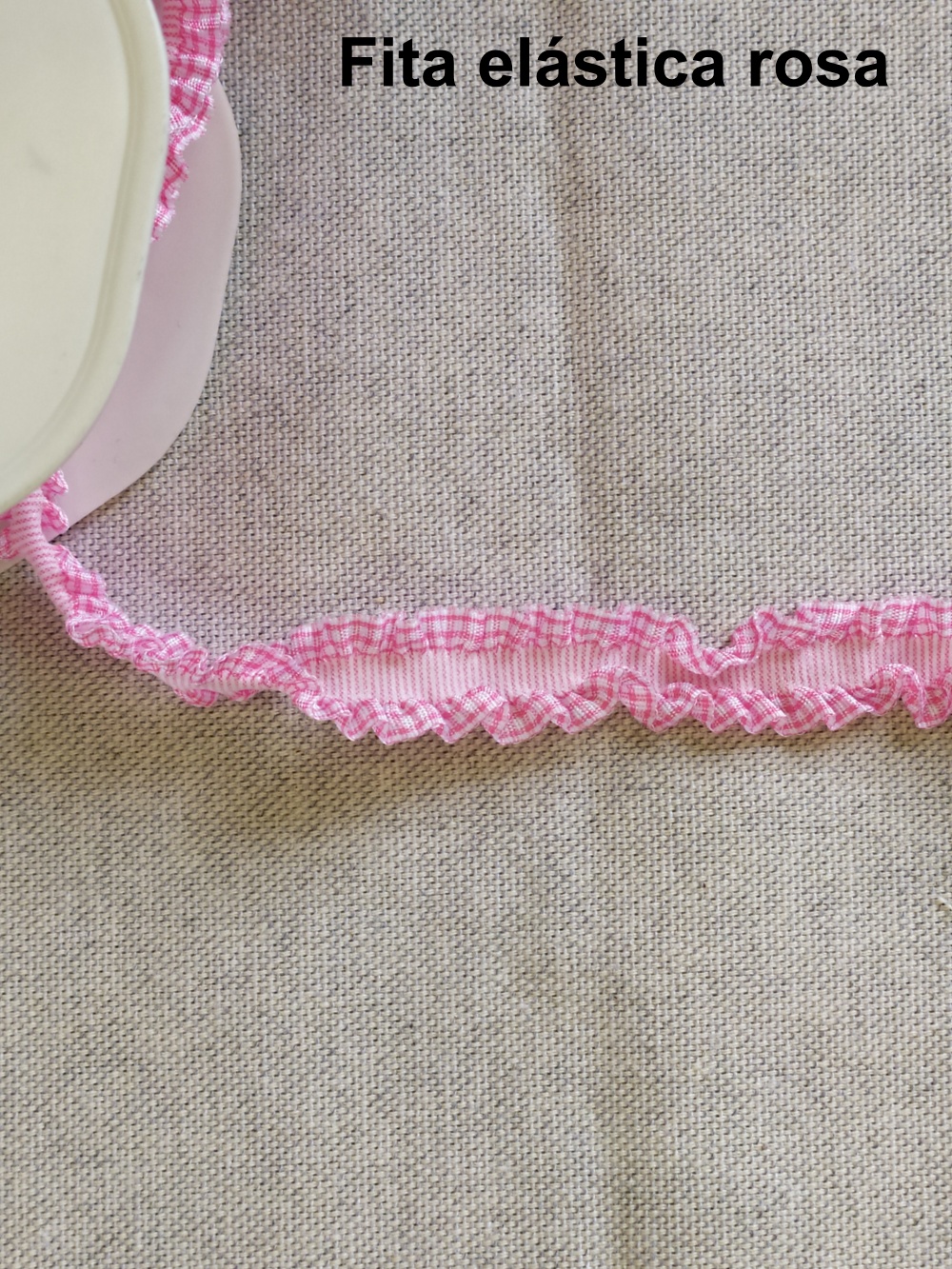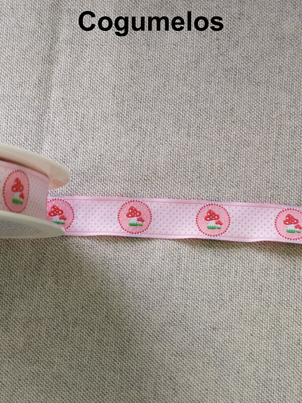 Fita rosa com padrão de cogumelos vermelhos em tecido sobre fundo cinzento