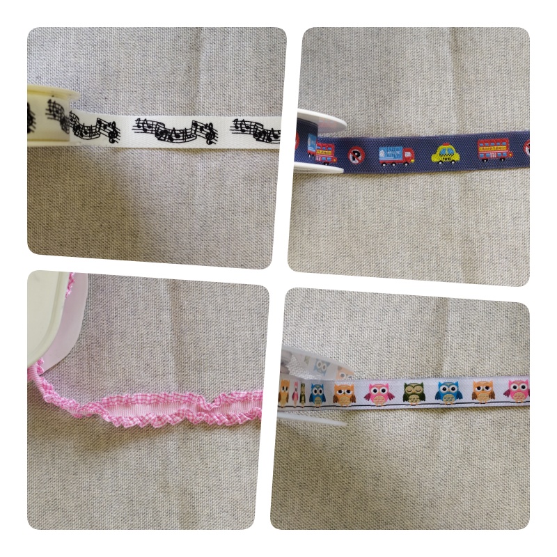 Quatro fitas decorativas coloridas com diferentes padrões sobre fundo bege