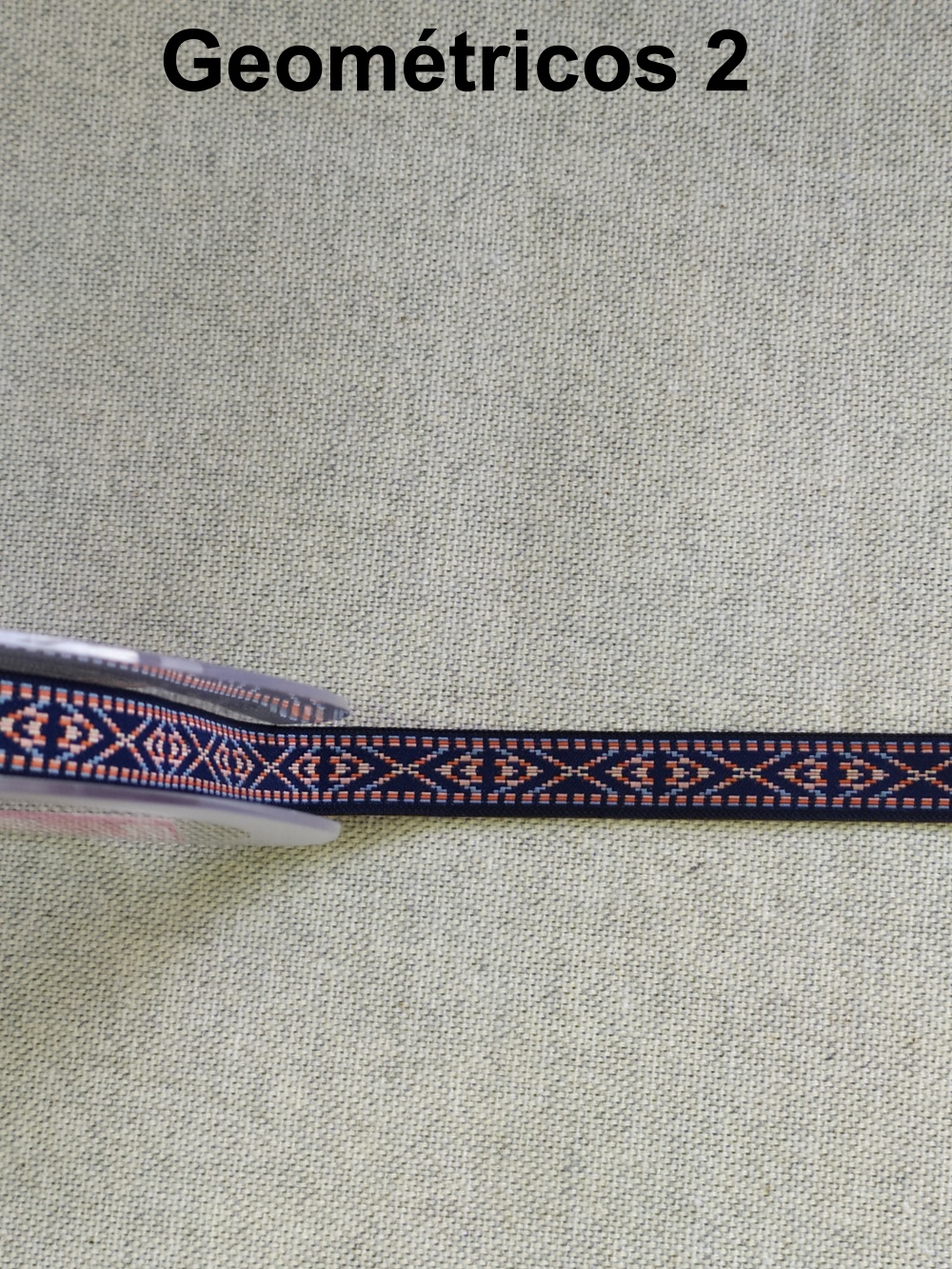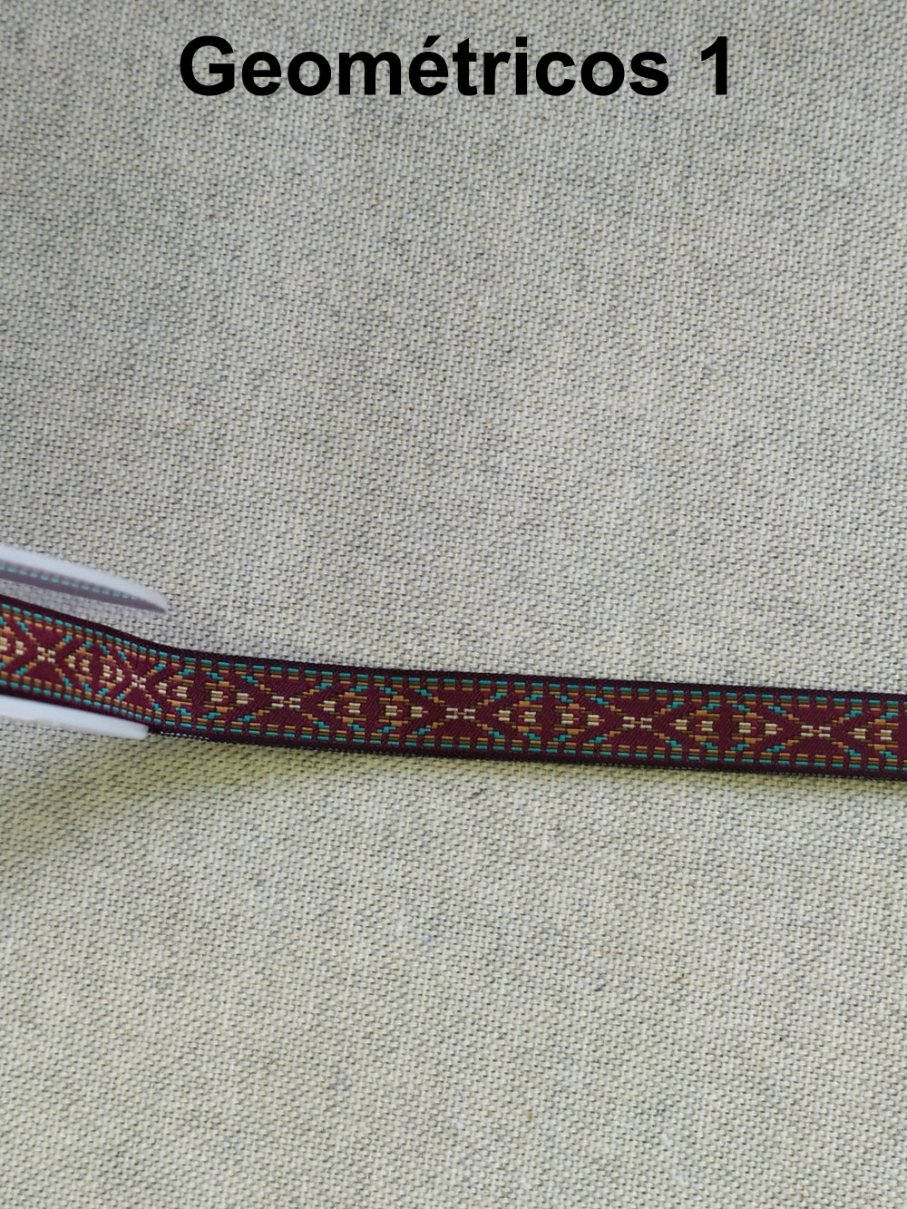 Fita têxtil estreita com padrão geométrico colorido sobre fundo bege.