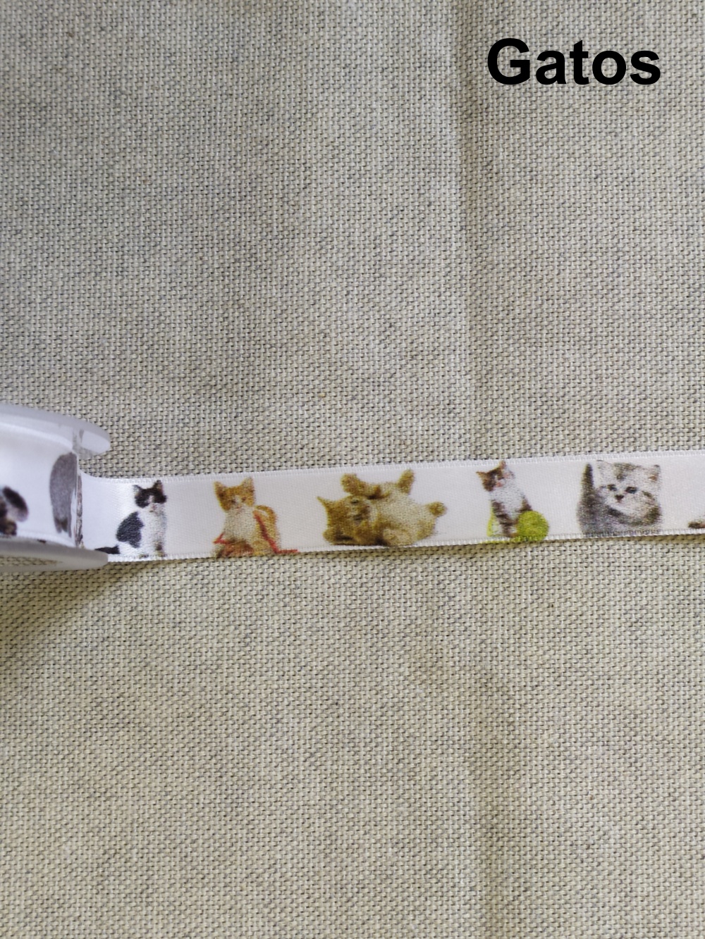 Fita decorativa branca com estampas de gatos coloridos sobre tecido bege