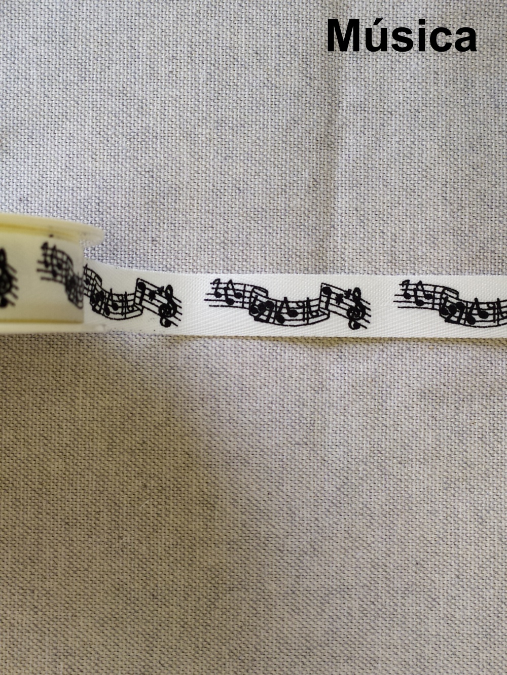 Fita branca com notas musicais pretas enrolada em carretel sobre tecido cinzento