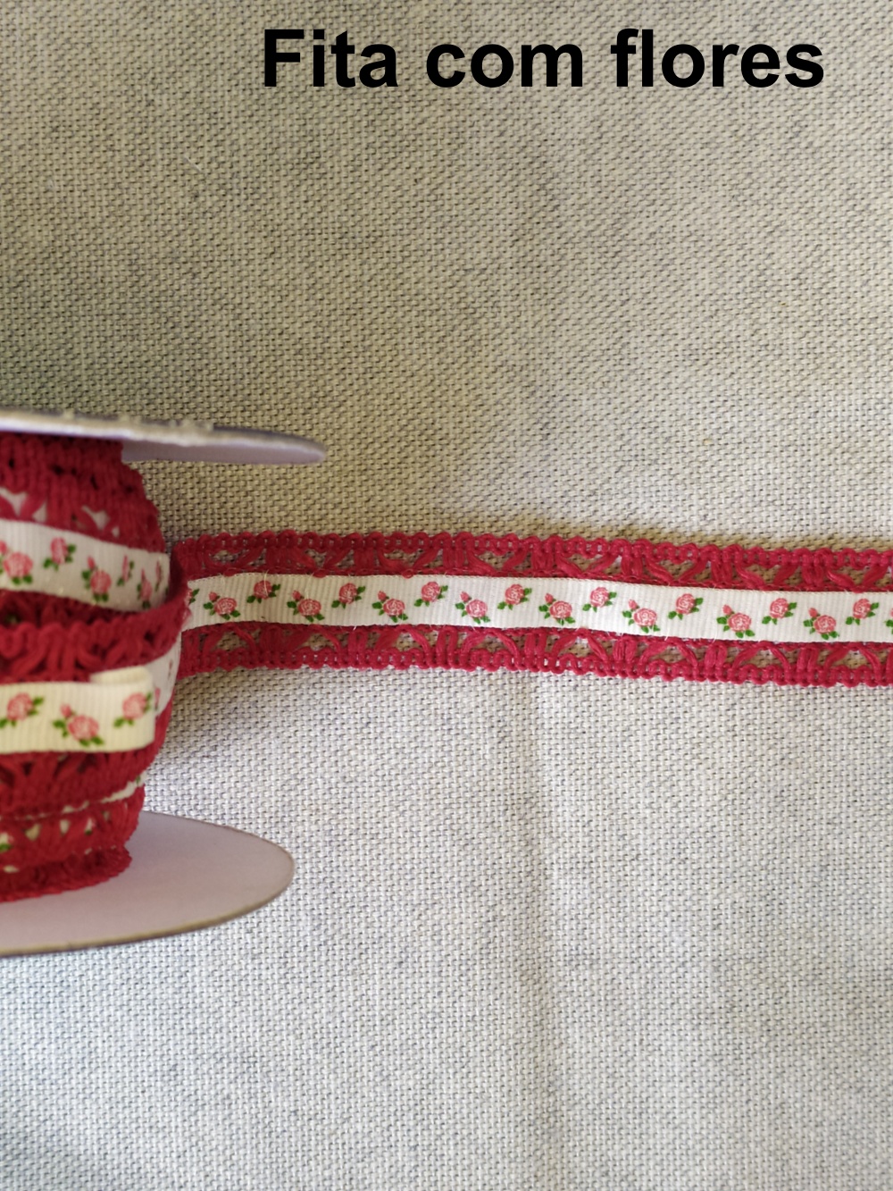 Fita decorativa com padrão de flores em fundo creme e borda vermelha