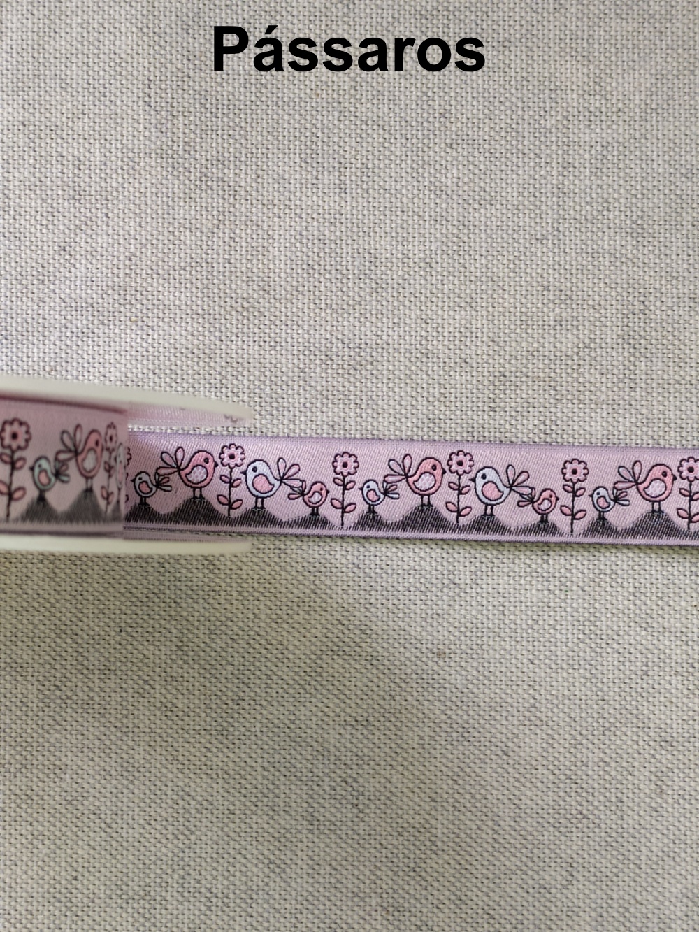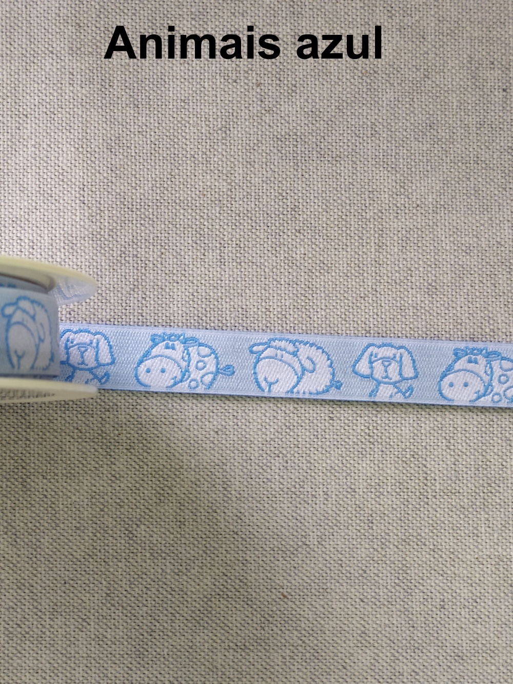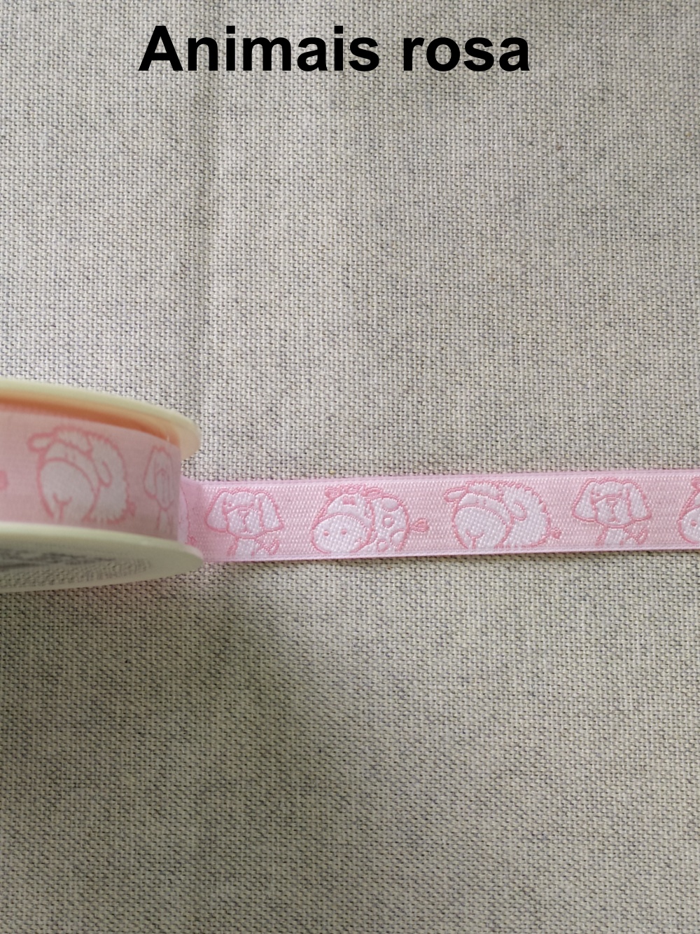 Fita rosa com desenhos em relevo de animais, rolo e fita estendida com texto 'Animais rosa' acima
