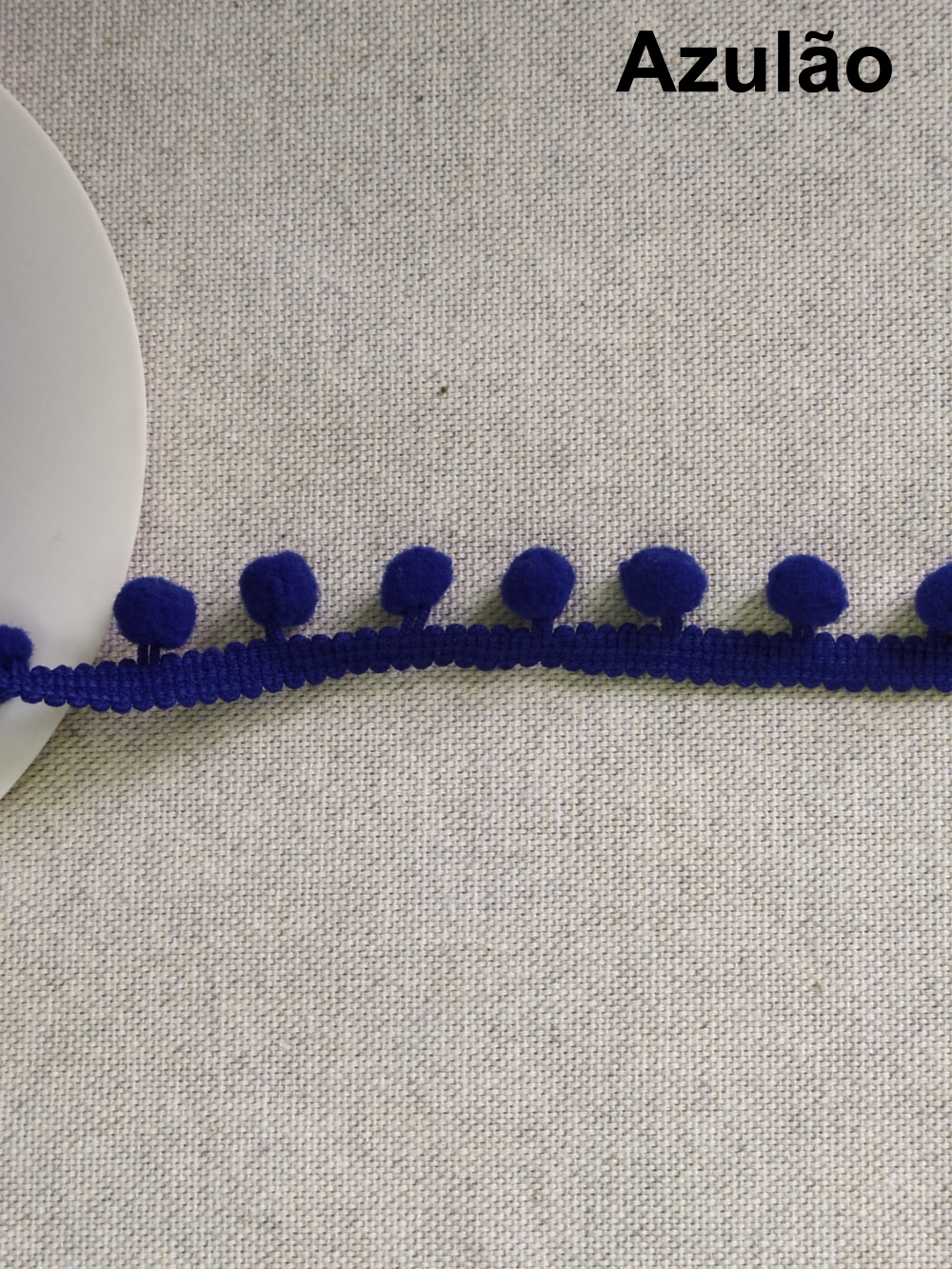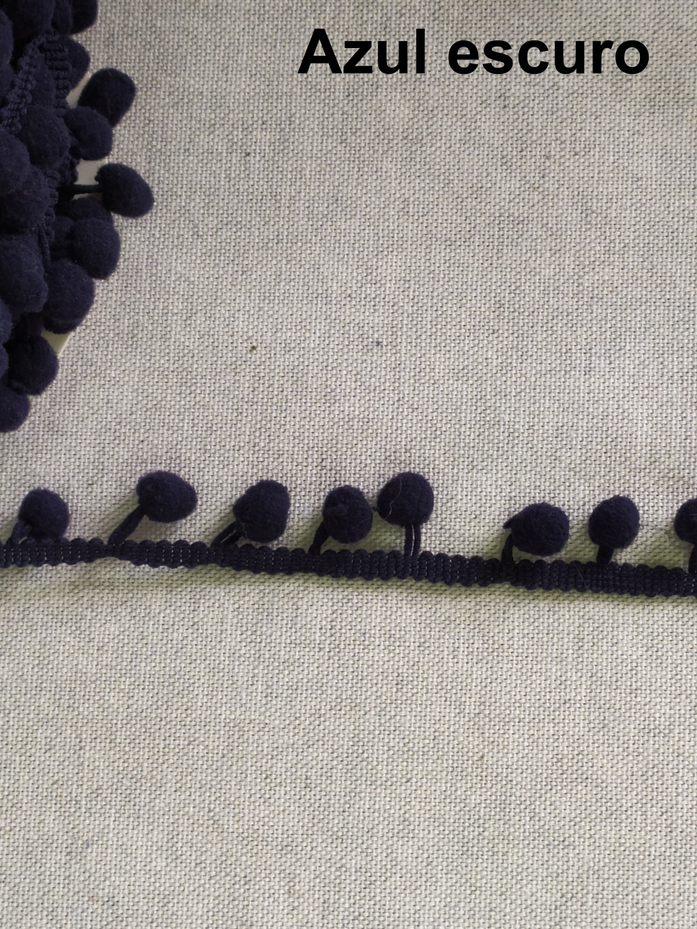 Tecido cinza claro com pompons azul escuro e texto 'Azul escuro'
