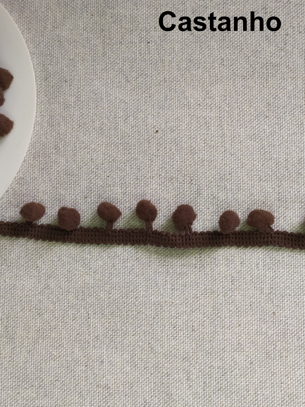 Fita decorativa castanha com bolas em tecido castanho sobre fundo cinzento claro com texto 'Castanho'