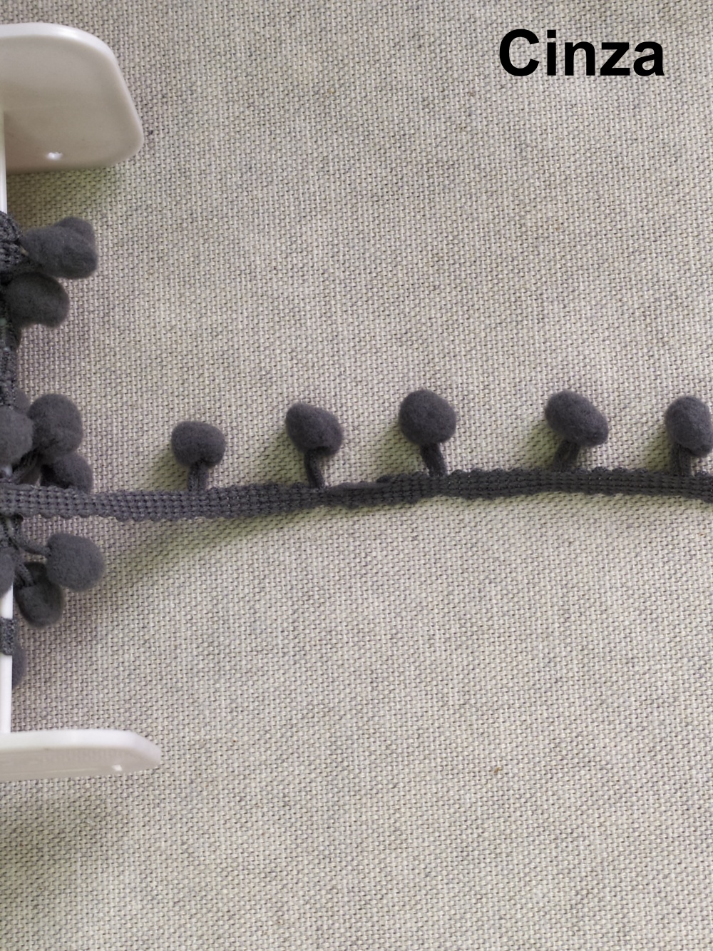 Fita de pompons brancos felpudos sobre tecido cinza.