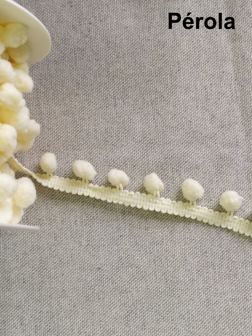 Fita de tecido pérola com bolas felpudas creme sobre fundo cinza