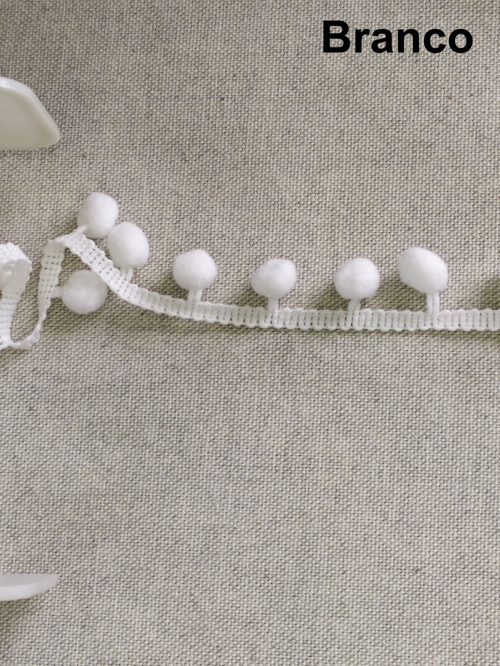 Fita decorativa branca com pequenas bolas sobre fundo cinza, texto 'Branco'