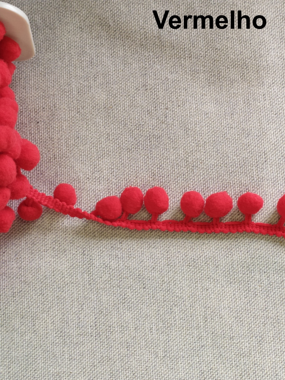 Fita vermelha com pompons em tecido bege
