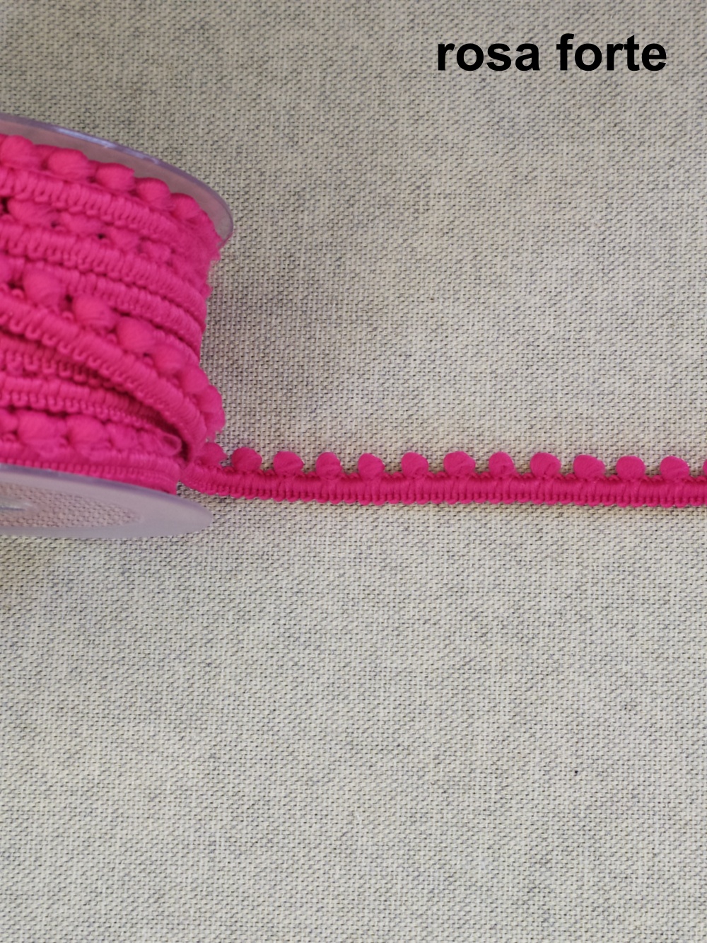 Rolo de fita decorativa rosa forte com pompons pequenos sobre tecido cinza