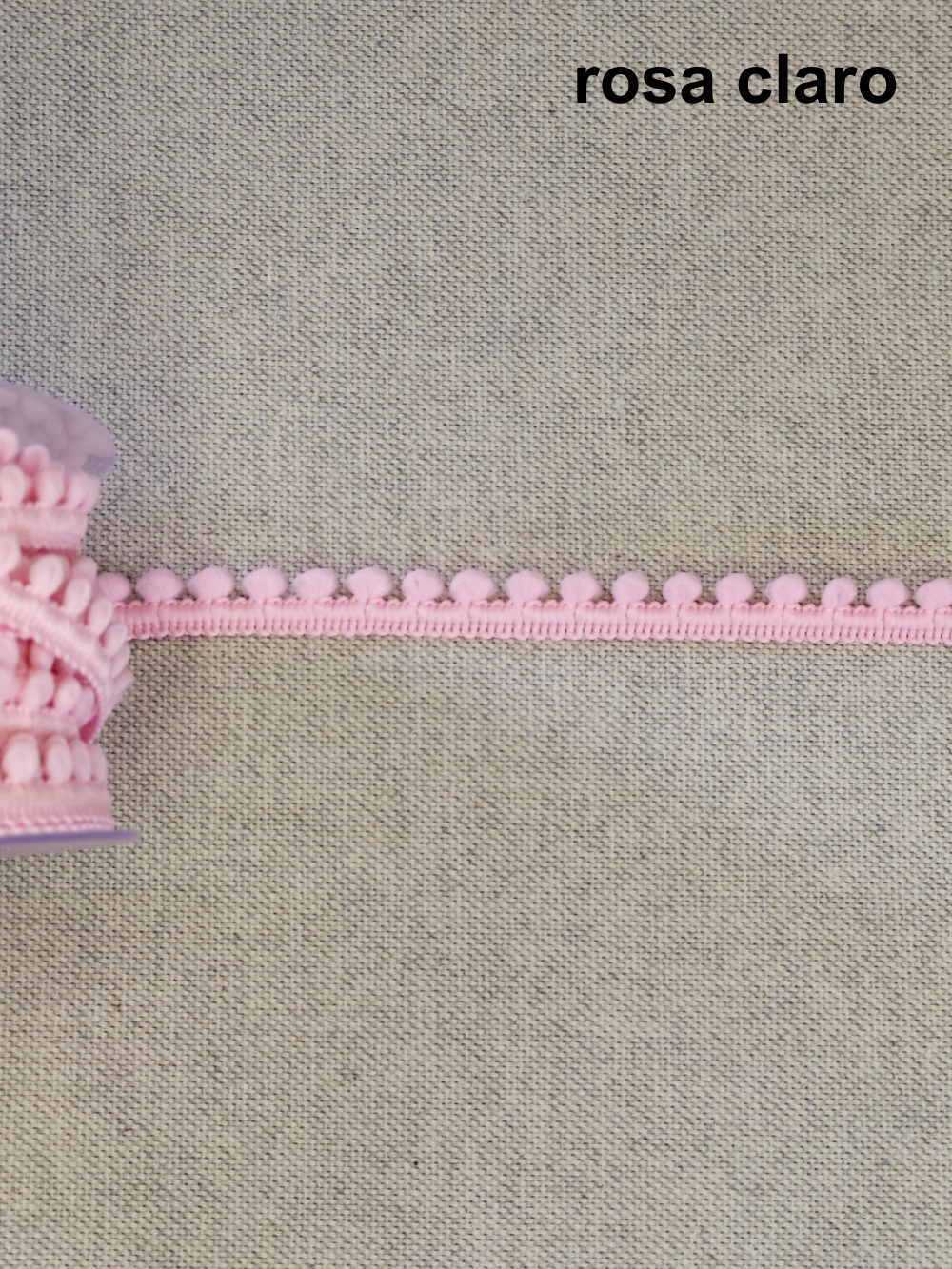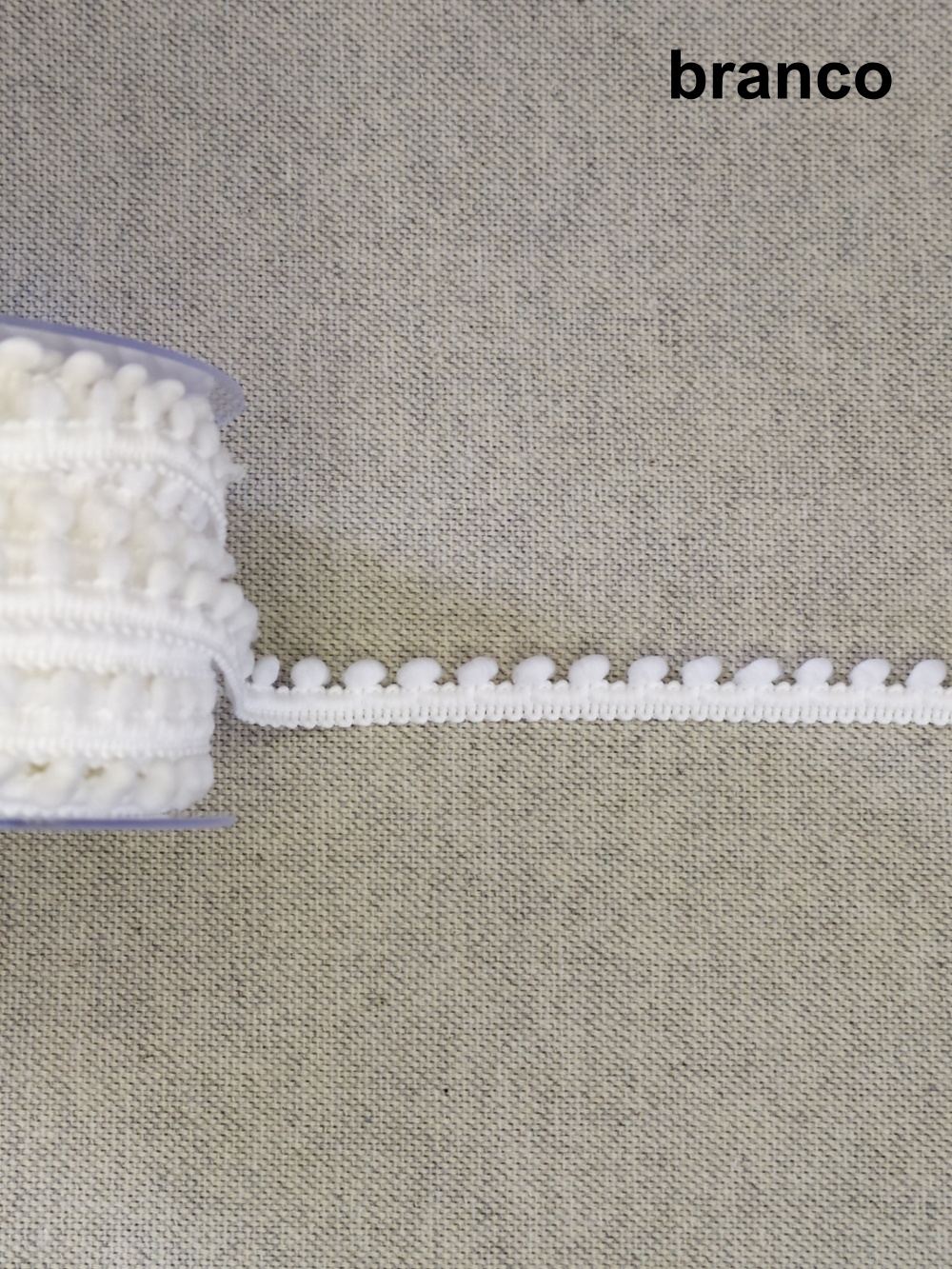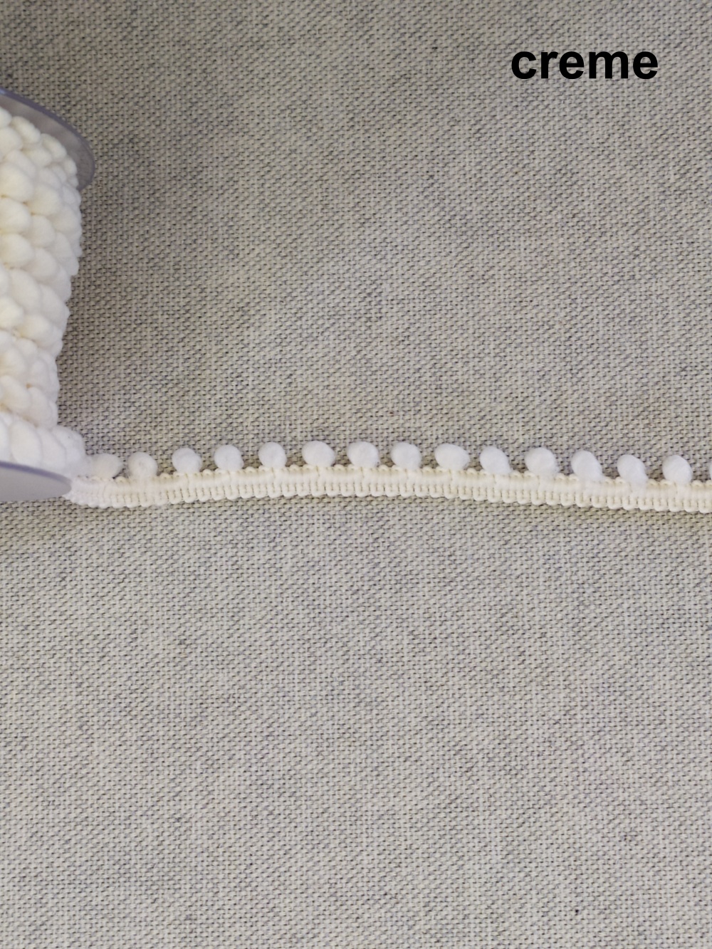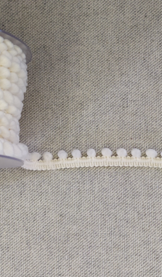 Rolo de fita decorativa creme com pequenos pompons sobre tecido cinza