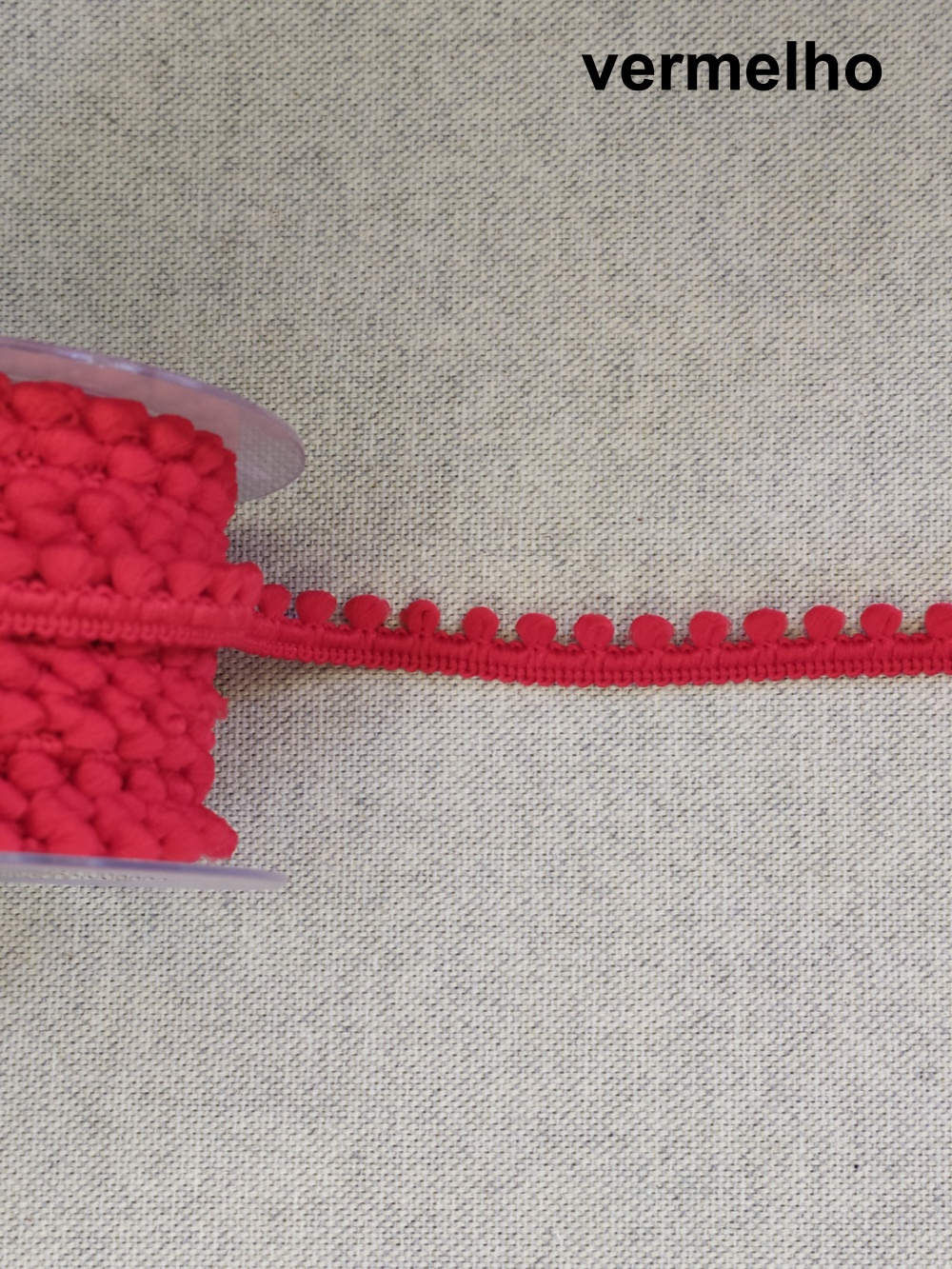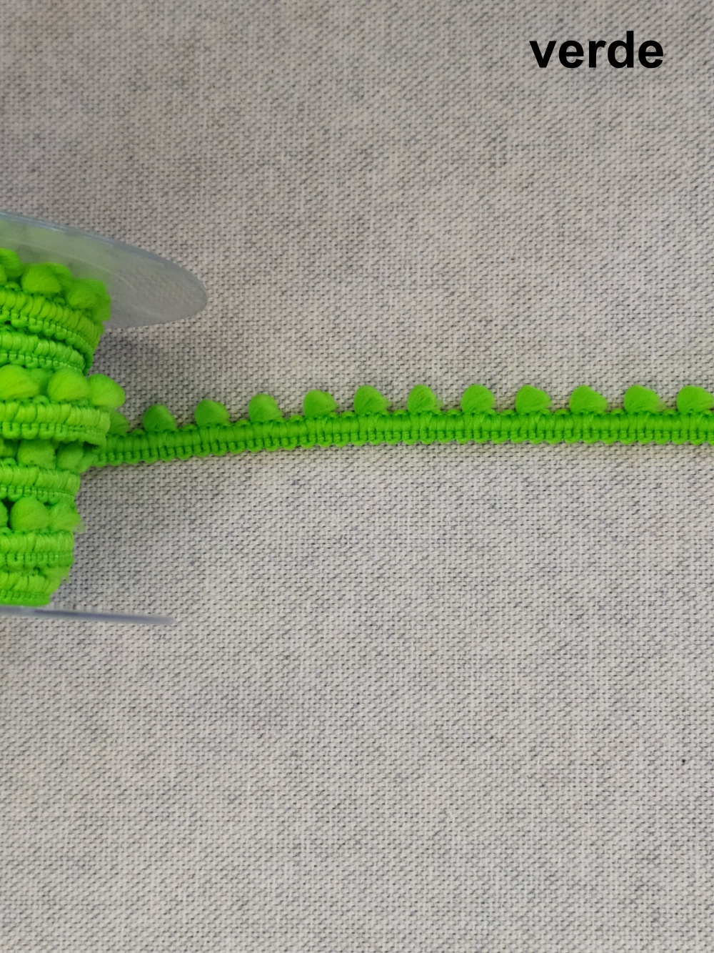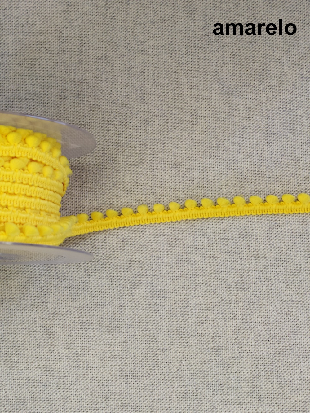 Rolo de fita decorativa creme com pequenos pompons sobre tecido cinza