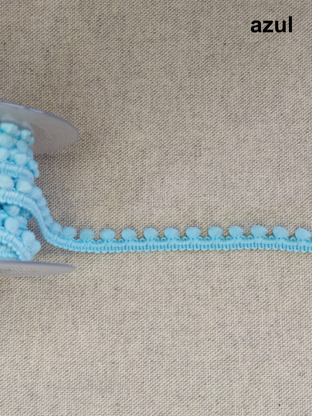 Rolo de fita azul com pompons sobre tecido cinza com texto 'azul'