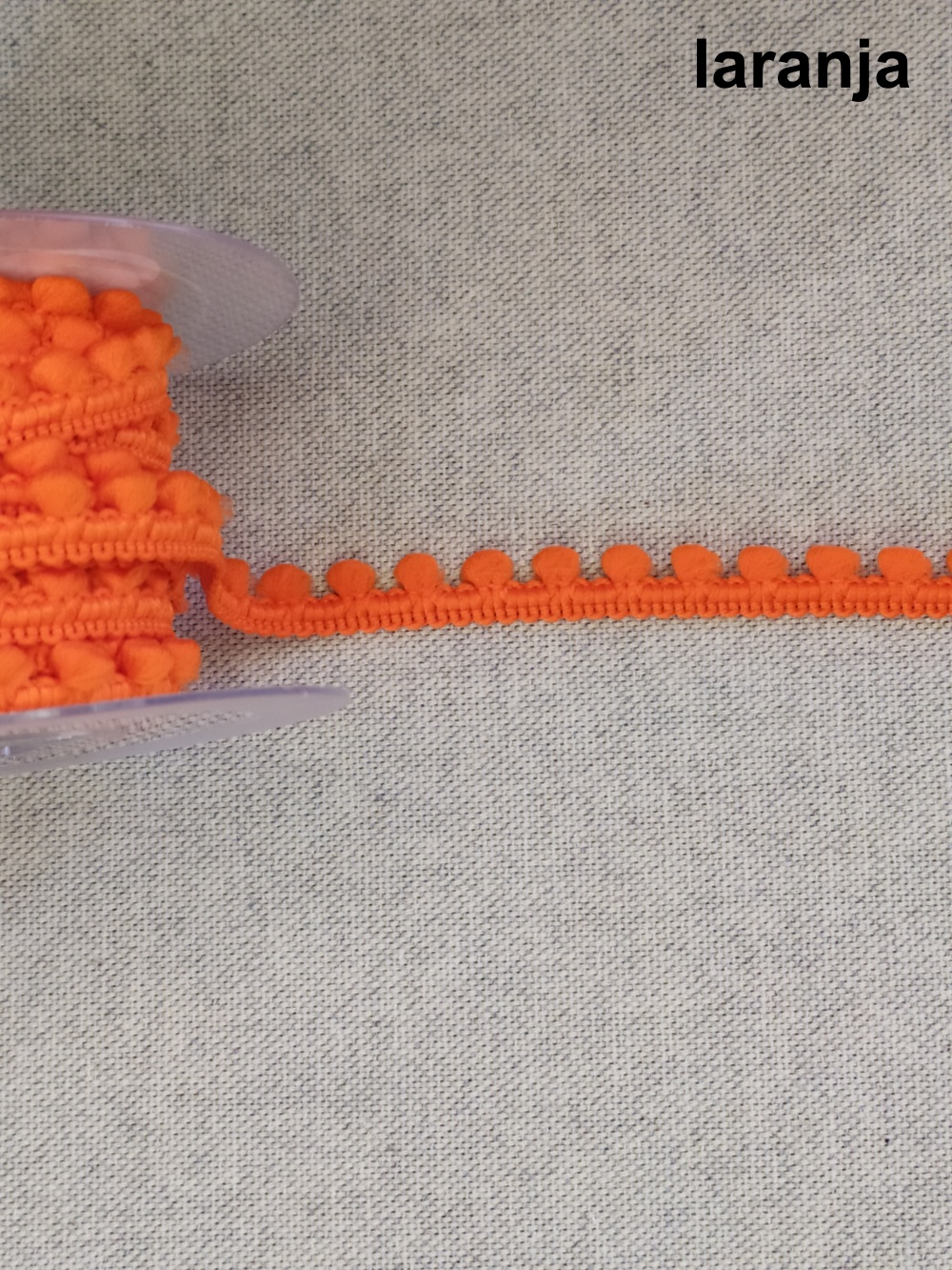 Fita de pompons laranja em carretel sobre tecido cinza