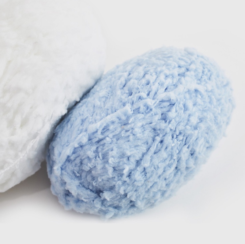 Objeto oval azul claro felpudo junto a objeto branco felpudo