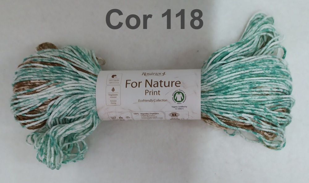 Skein of multicolored yarn with label 'For Nature Print' and text 'Cor 118' above