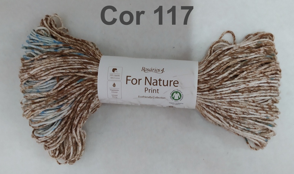 Novelo de fio multicolorido com etiqueta branca e texto 'For Nature Print', 'Cor 117'