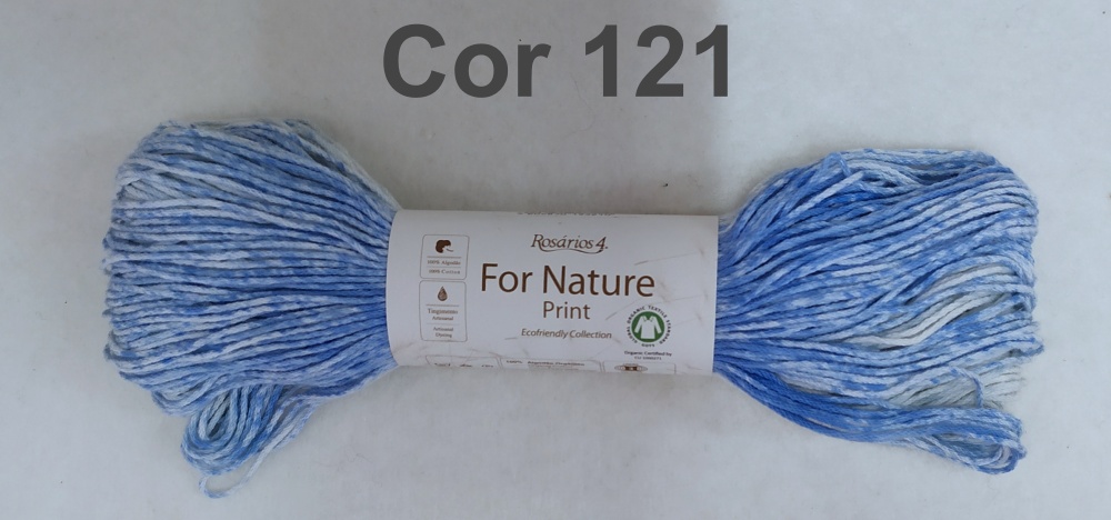 Fio de lã azul claro e branco com etiqueta 'For Nature Print Cor 121' sobre fundo branco
