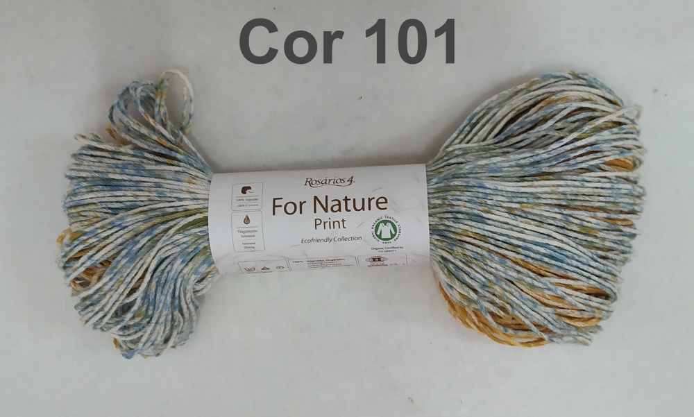 Novelo de fio multicolorido com etiqueta 'For Nature Print' e indicação 'Cor 101'