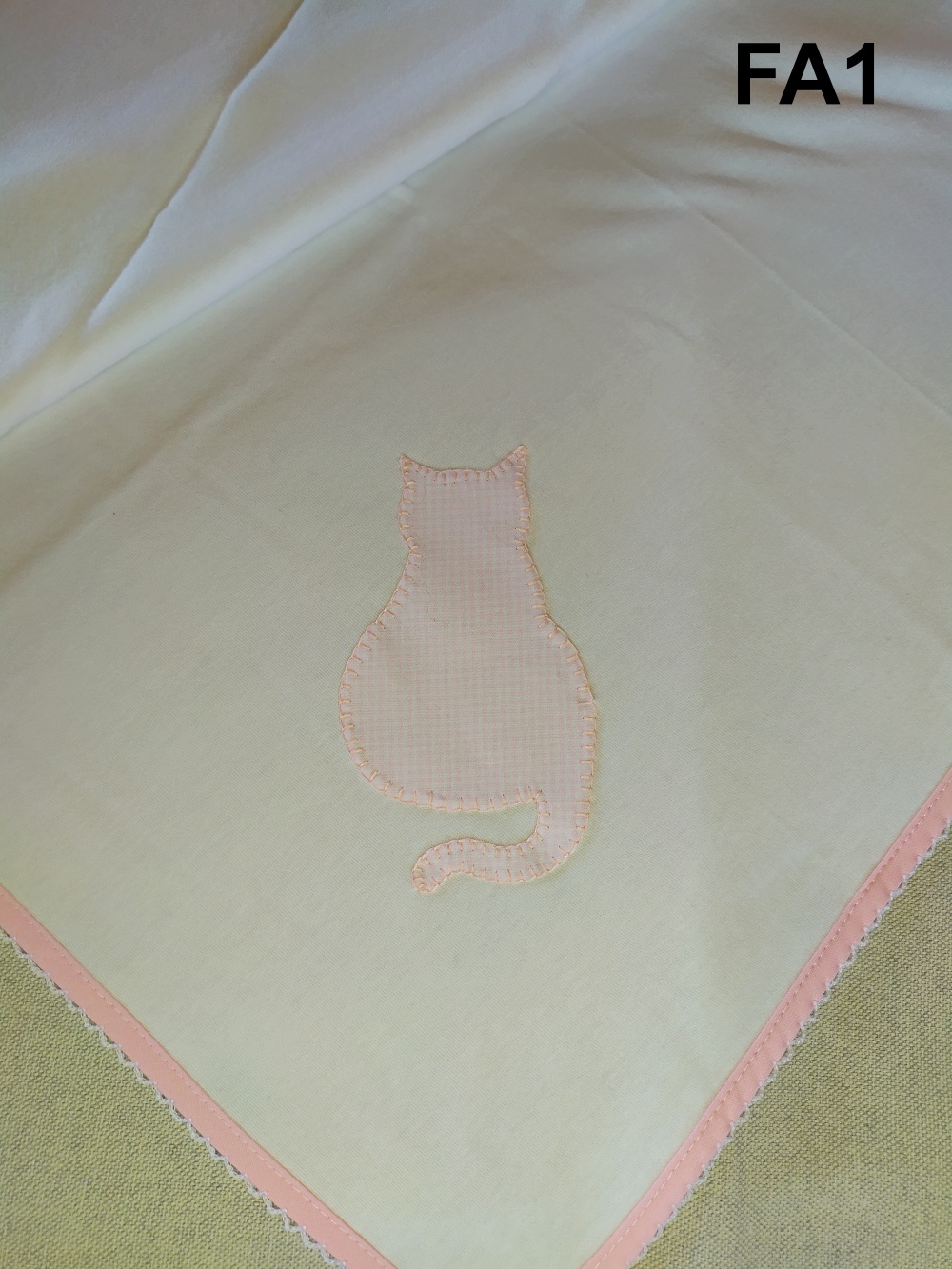 Toalha branca com aplicação de gato cor-de-rosa e borda cor-de-rosa com texto FA1