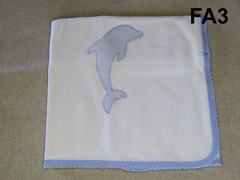 Manta branca com aplicação de golfinho azul e borda azul com padrão branco