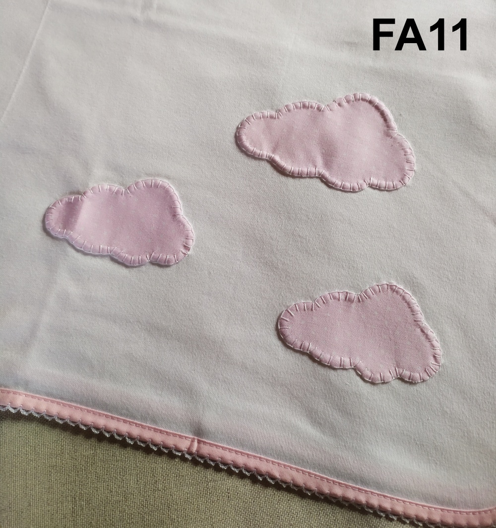 Pano branco com nuvens cor-de-rosa aplicadas e borda cor-de-rosa