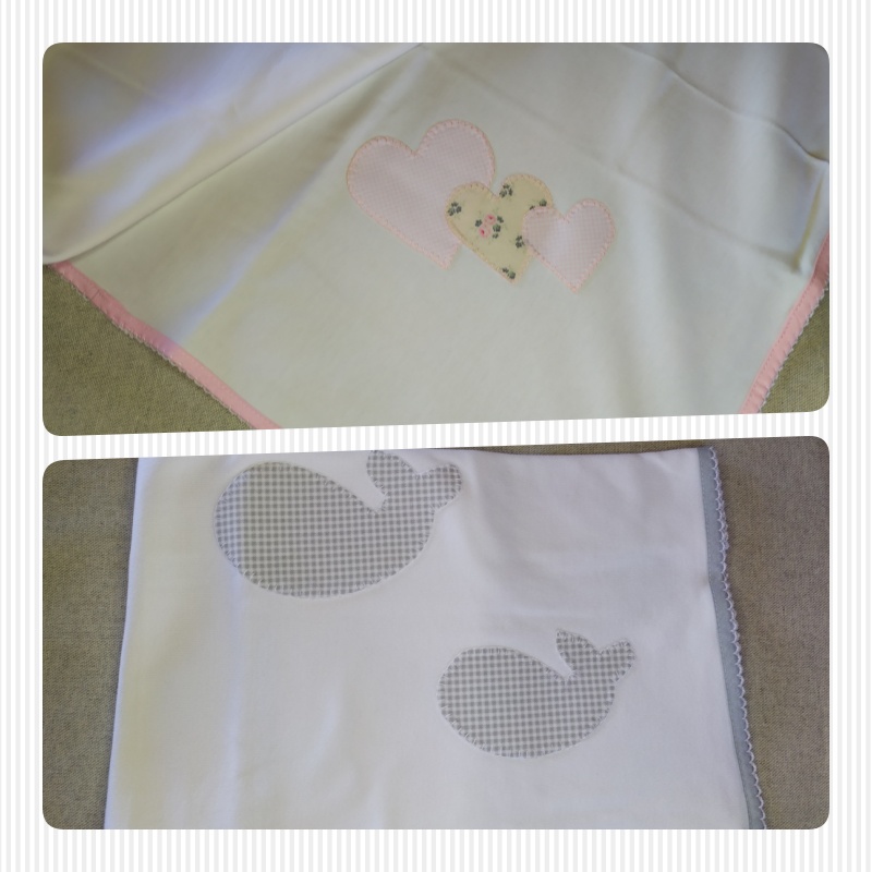 Dois panos de tecido branco com aplicações decorativas, corações e baleias