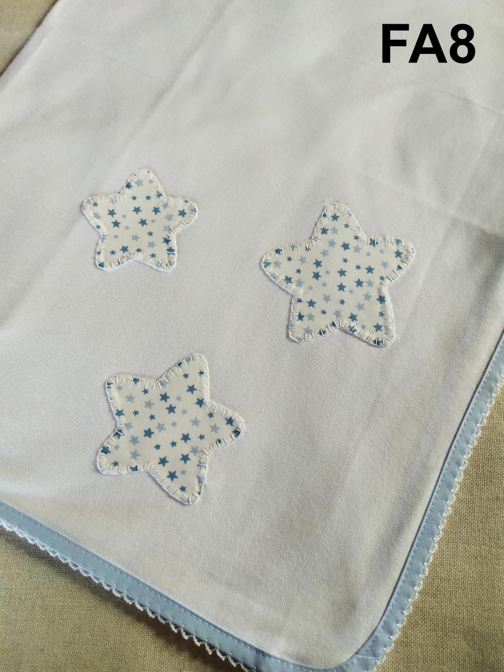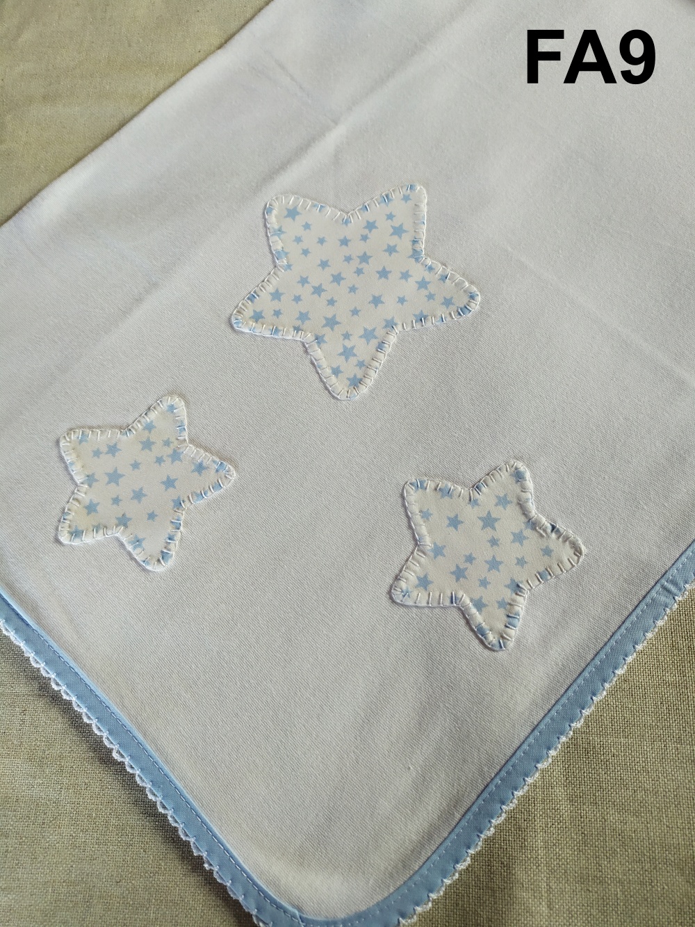 Manta branca com estrelas azuis e borda azul com renda