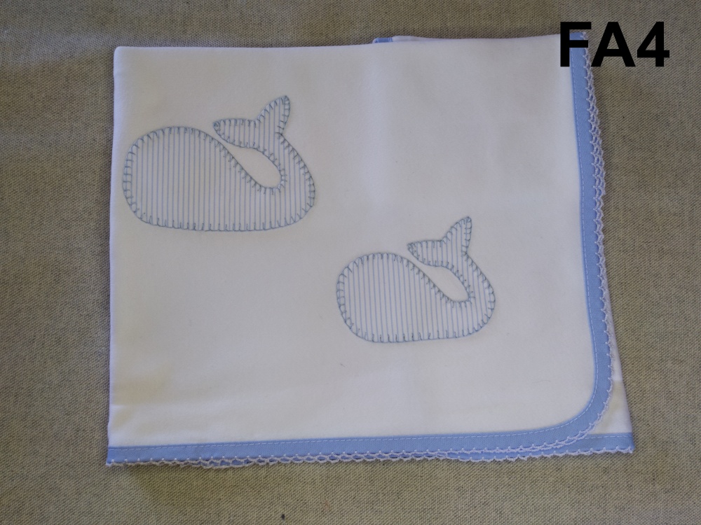 Fralda branca com bordas azuis e bordados de baleias azuis sobre tecido bege