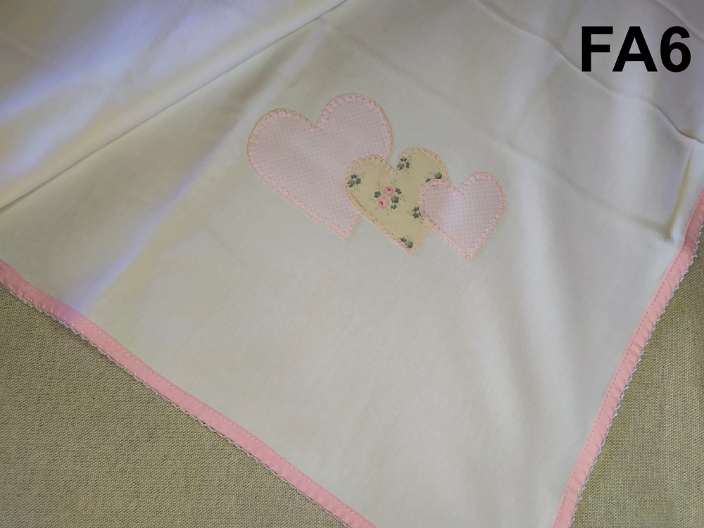 toalha branca com borda rosa e corações aplicados, etiqueta FA6