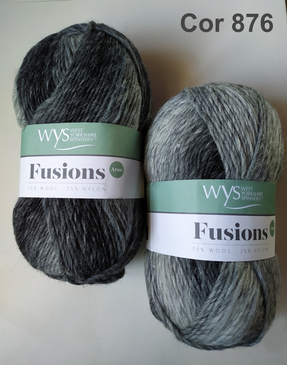 Dois novelos de lã cinzenta e preta Fusions da West Yorkshire Spinners com etiquetas verdes e brancas.