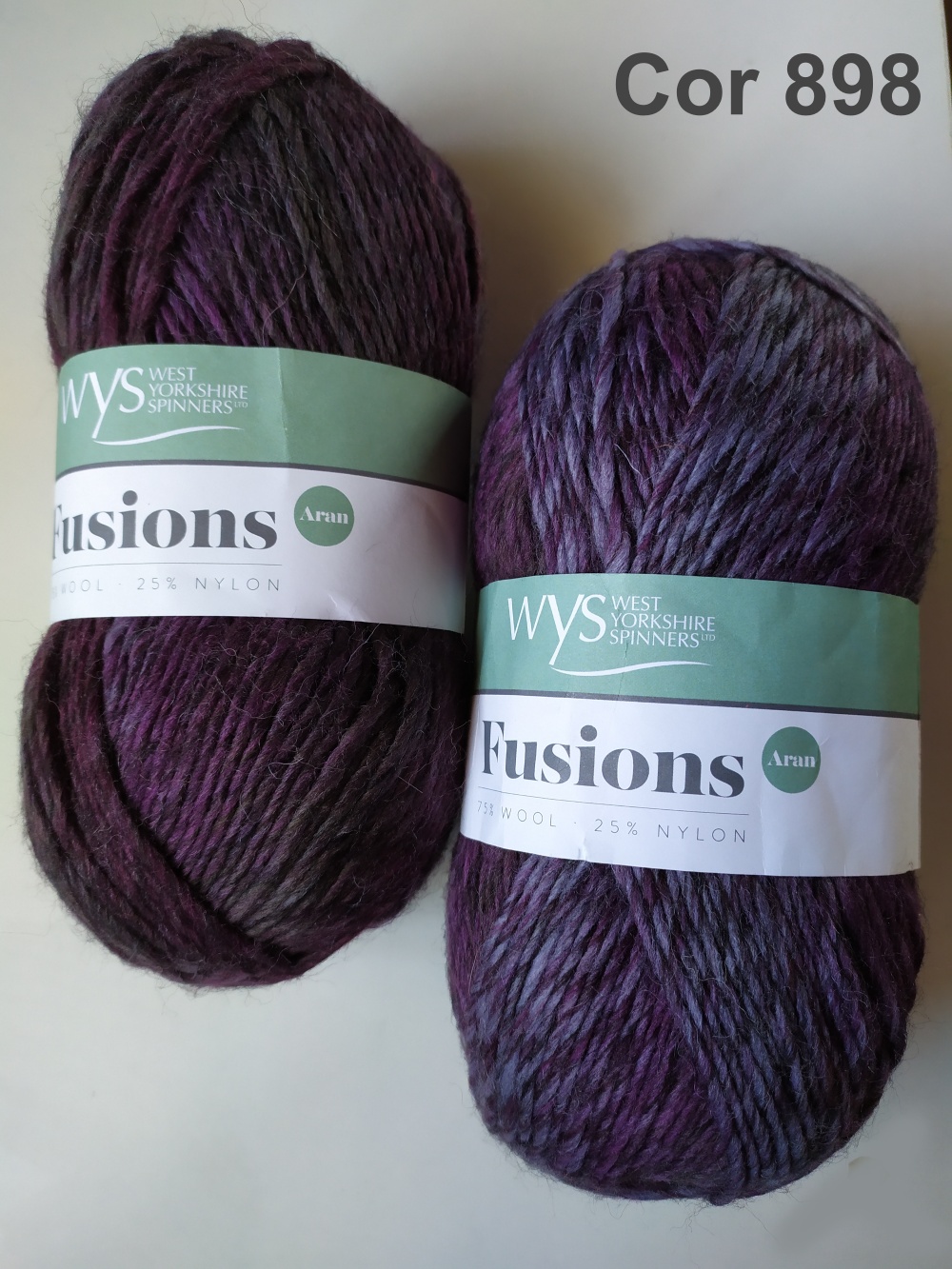 Dois novelos de lã roxa Fusions Aran da West Yorkshire Spinners com etiquetas verdes
