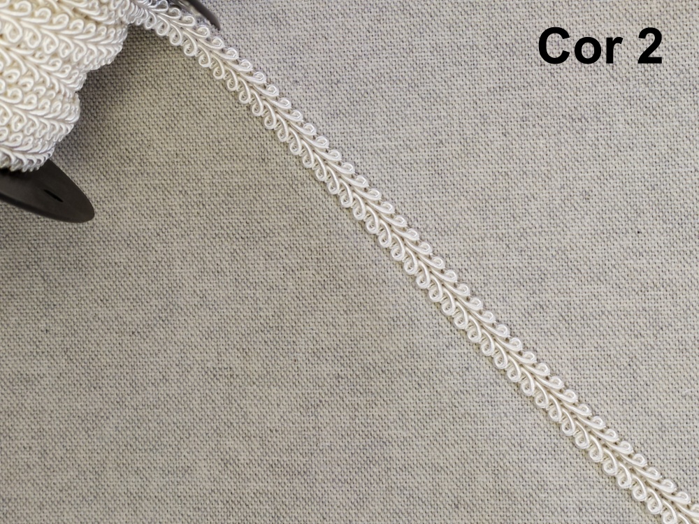 Fita decorativa branca enrolada em carretel preto sobre fundo cinza com texto Cor 2