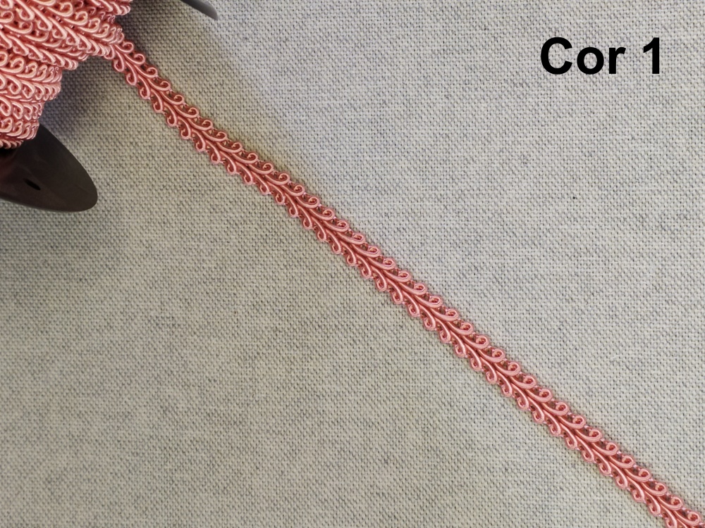 Fita decorativa rosa com padrão ondulado sobre tecido cinza