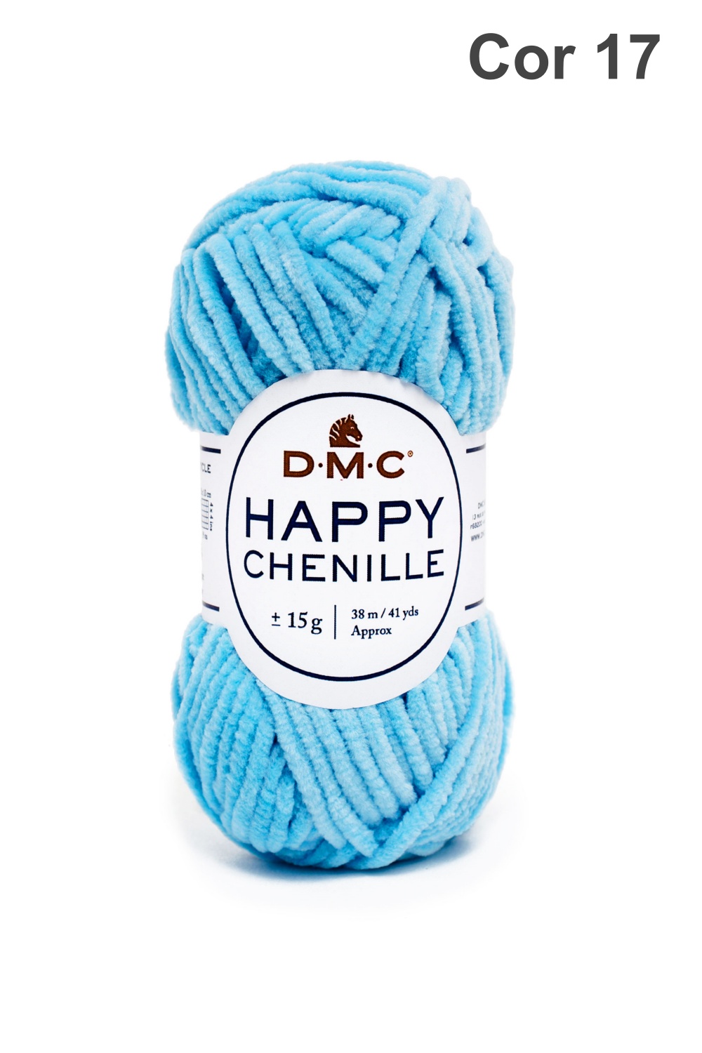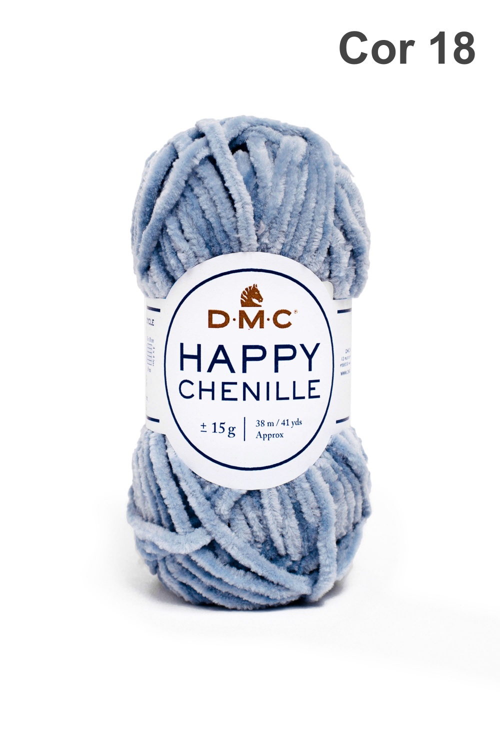 novelo de lã azul claro da marca D.M.C. modelo HAPPY CHENILLE com etiqueta visível