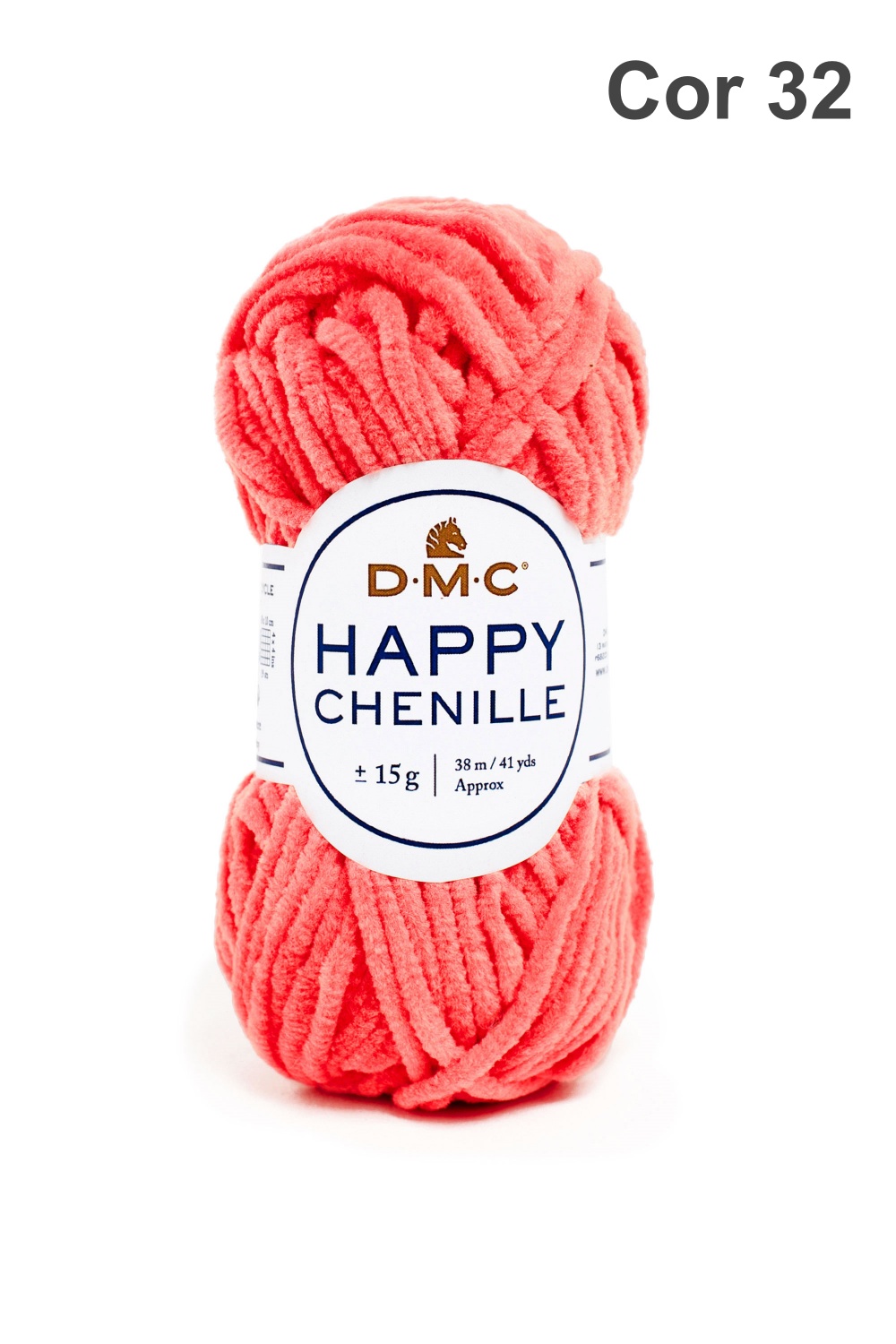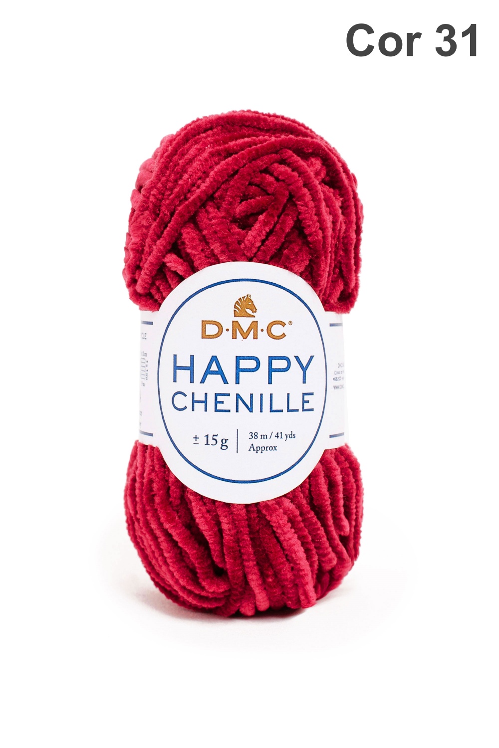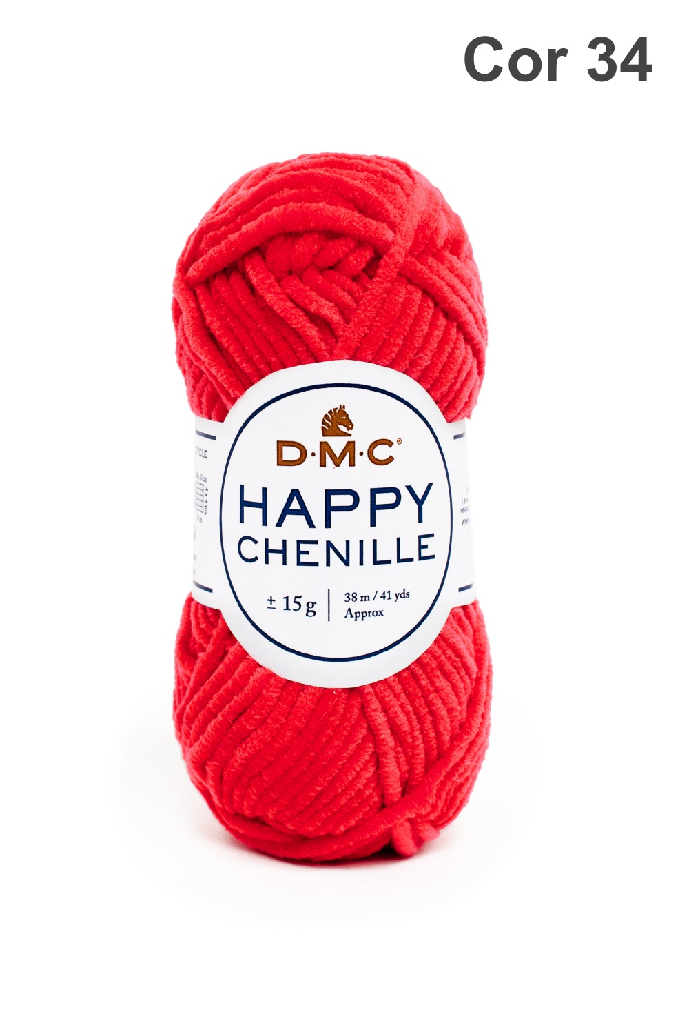 Novelo de lã chenille vermelho D.M.C HAPPY CHENILLE com etiqueta e texto Cor 34
