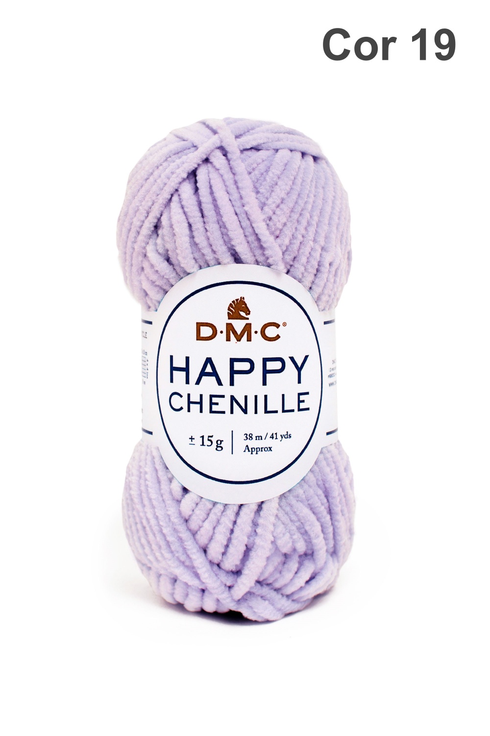 Três novelos de lã de chenille em cores laranja, azul e lilás com etiquetas DMC Happy Chenille