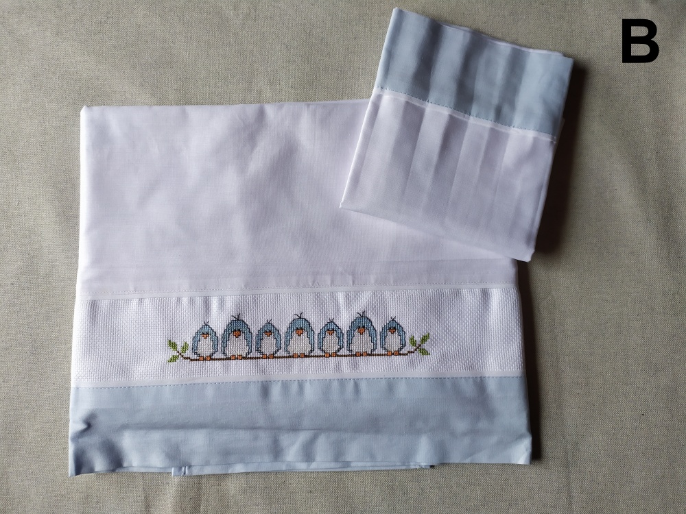 Roupa de cama para bebé branca e azul com bordado de pinguins