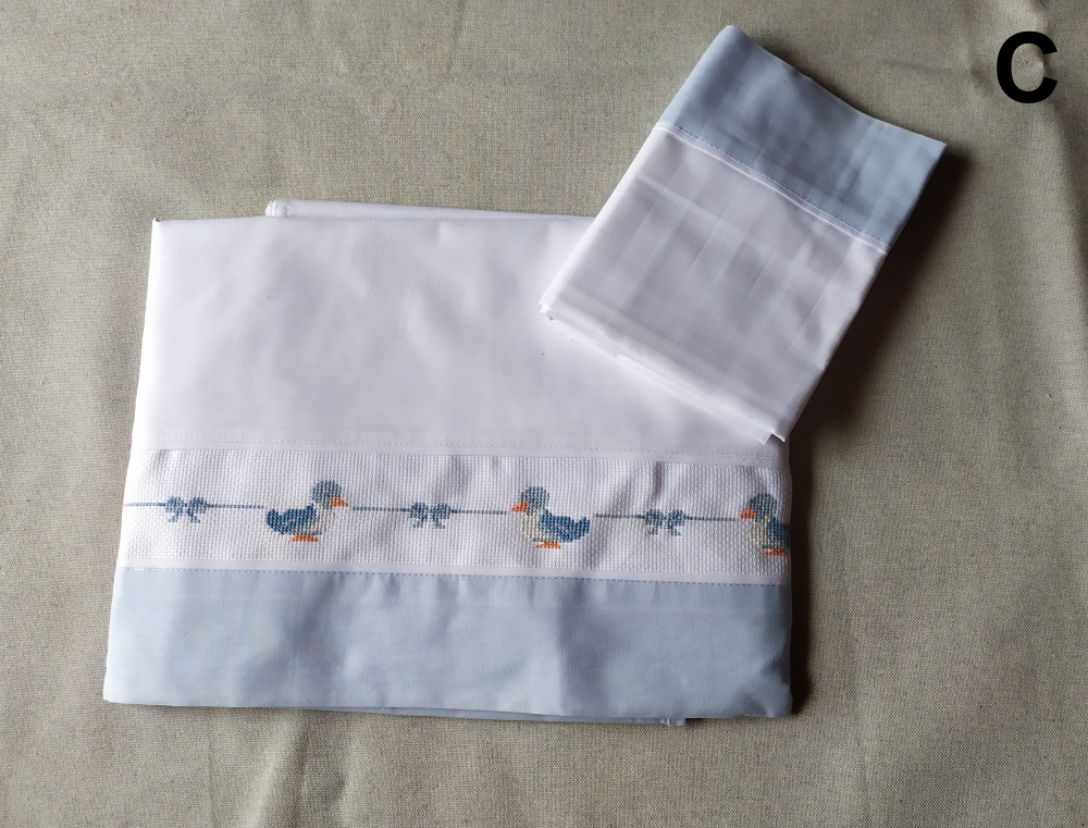 Conjunto de roupa de cama infantil branco e azul com bordado de patinhos