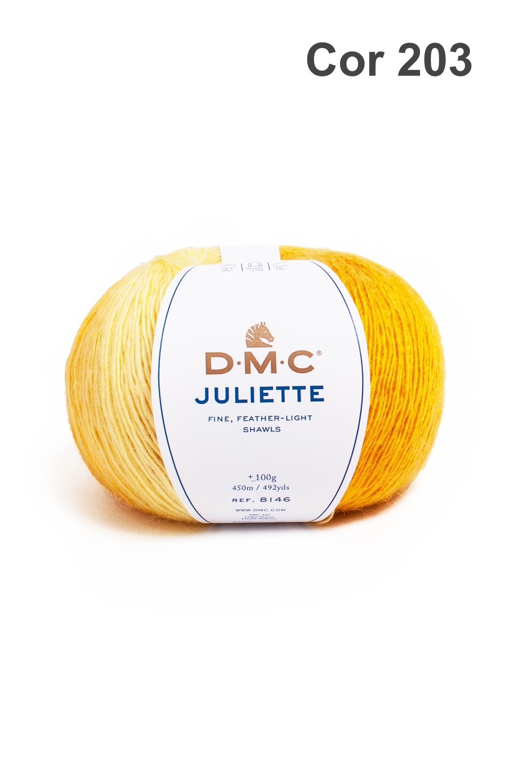 Novel de lã DMC Juliette em amarelo, com rótulo branco e texto, sobre fundo branco