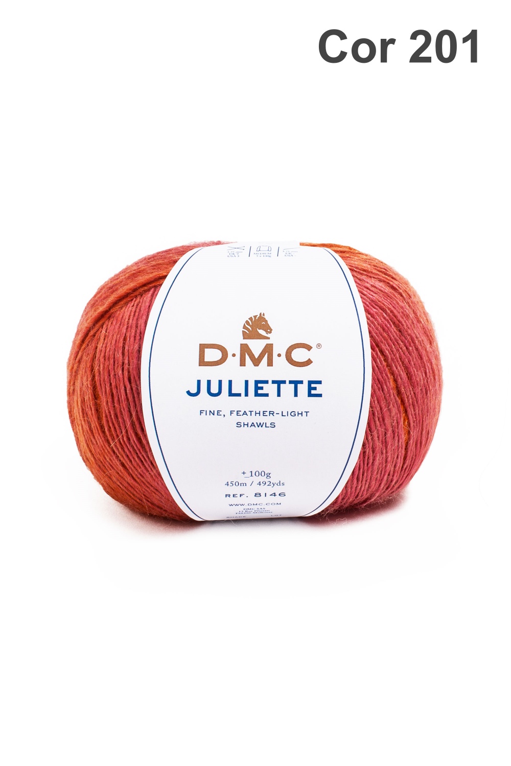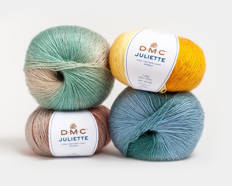 Quatro novelos de lã D.M.C. Juliette em cores variadas com etiquetas brancas.