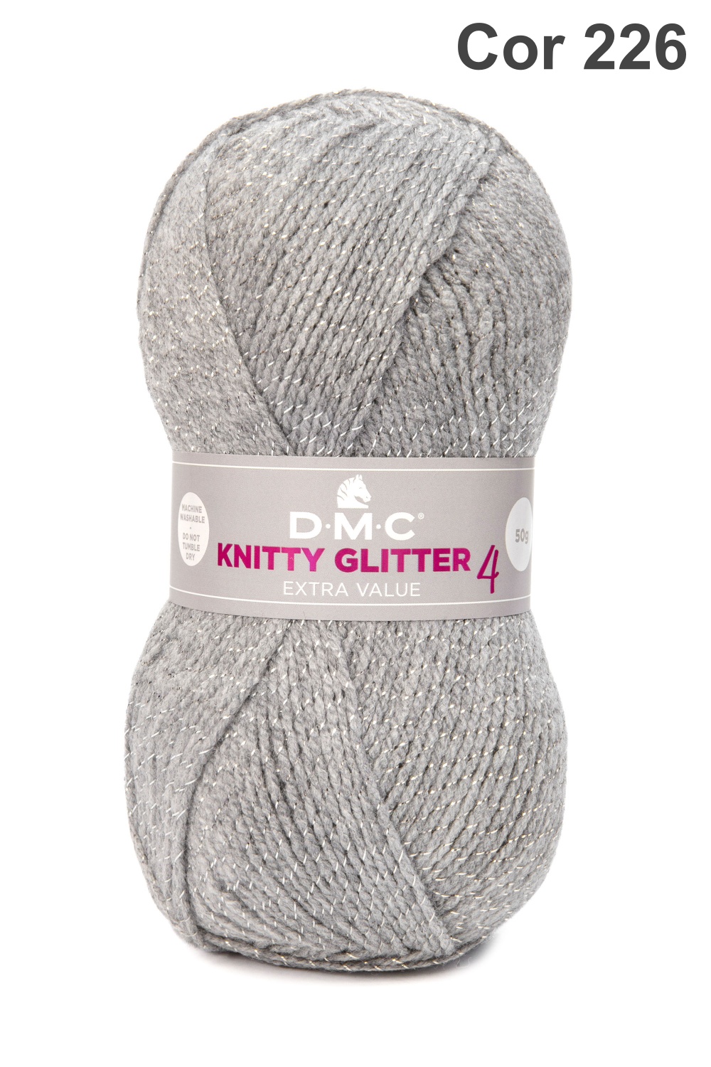 Novelo de lã cinzenta com brilhos prateados e etiqueta DMC KNITTY GLITTER 4 EXTRA VALUE