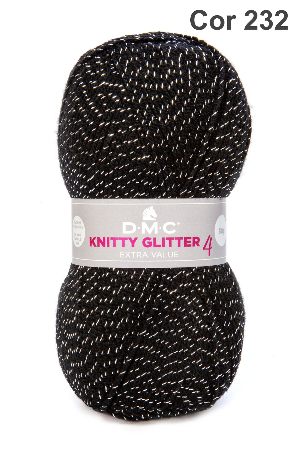 Novelo de fio preto com brilho prateado com etiqueta branca D.M.C KNITTY GLITTER 4