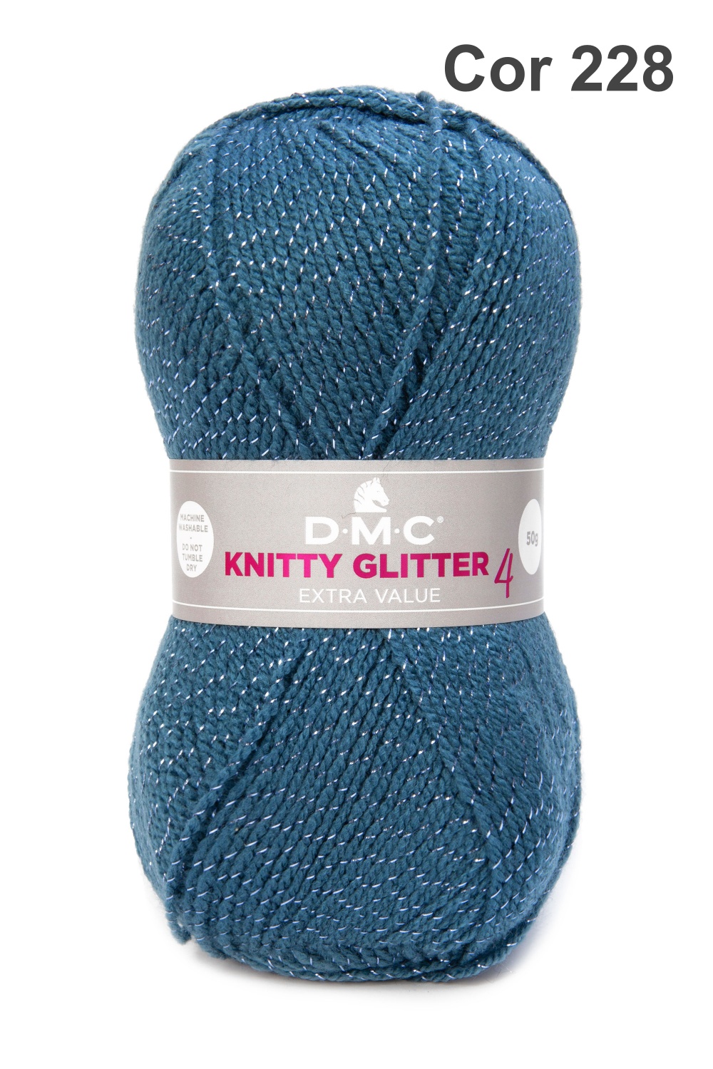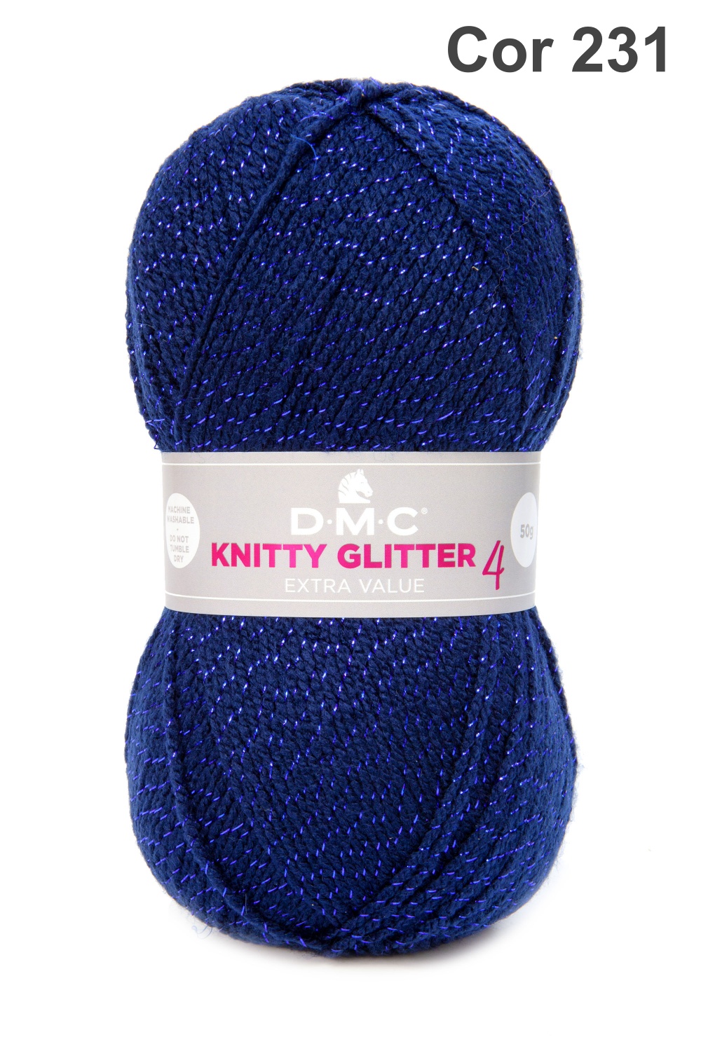 Novelo azul escuro com brilho metálico e etiqueta DMC Knitty Glitter 4