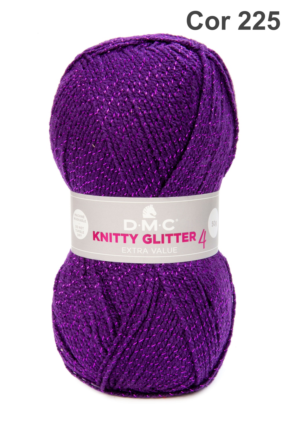 Novelo de fio de lã roxo com brilho metálico prateado e rótulo informativo.