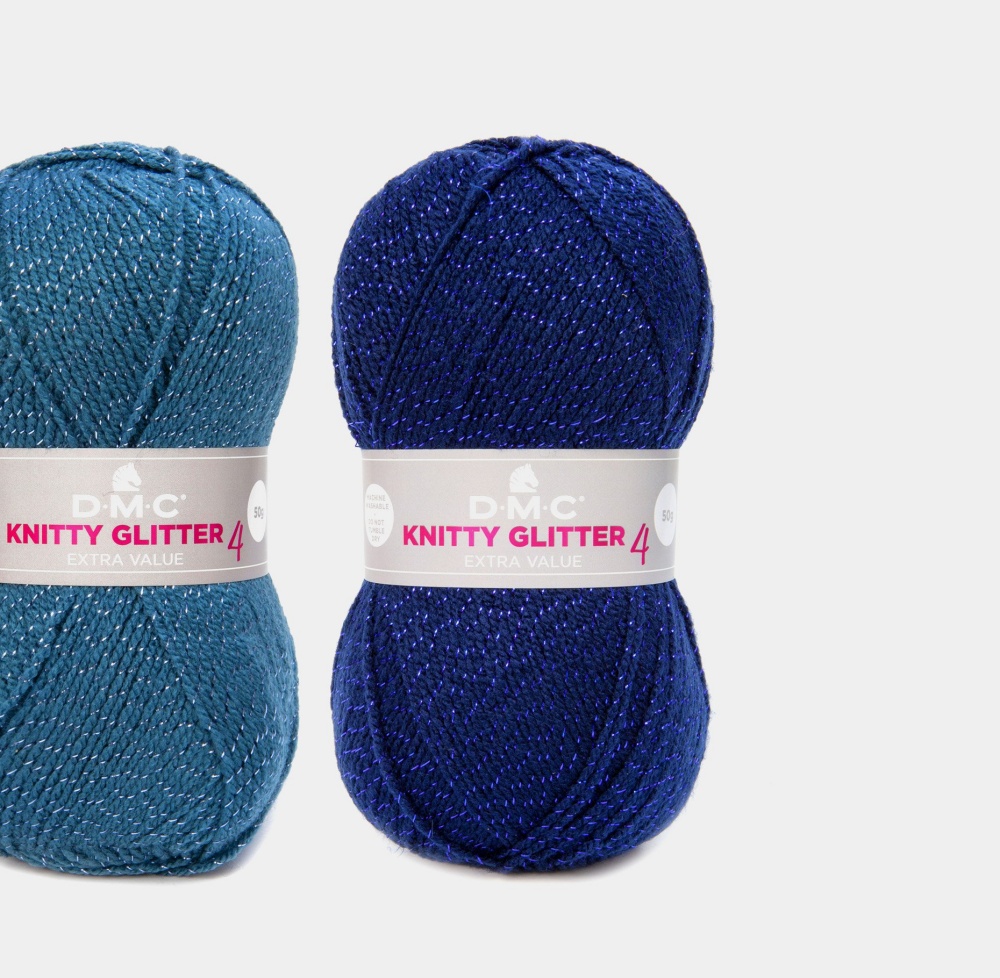 Dois novelos de linha para tricô azul-turquesa e azul-escuro com brilho e etiquetas DMC KNITTY GLITTER 4