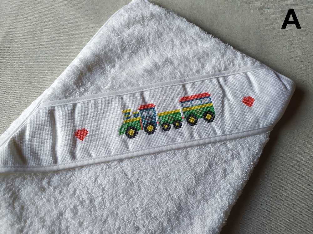 Toalha branca com capa bordada com comboio colorido e corações