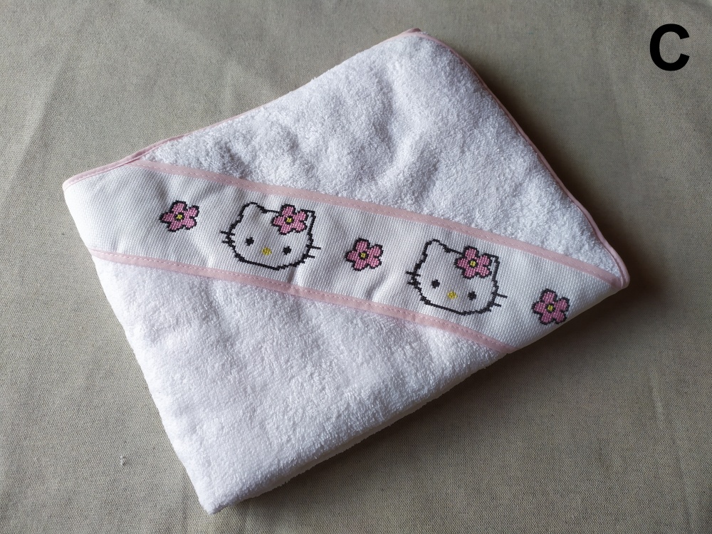 Paninhos de banho brancos com bordados de comboio e Hello Kitty.