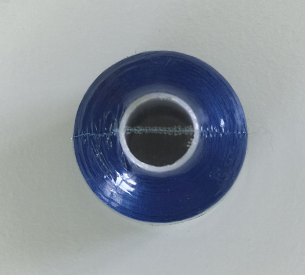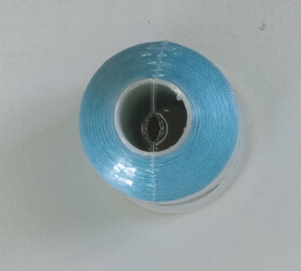 Rolo de linha azul claro embrulhado em plástico sobre superfície branca